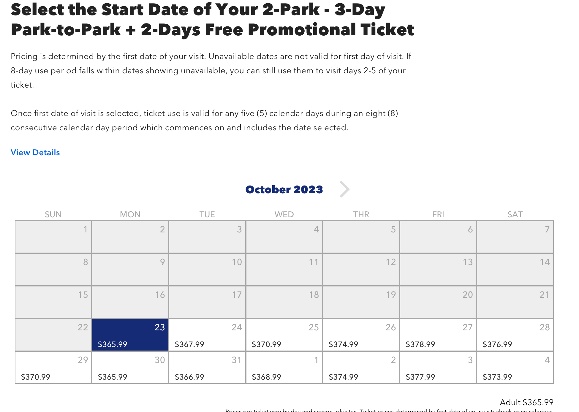 To verify the pricing for your desired dates, select your ticket type to see the most up-to-date availability and pricing. Ticket prices are based on the first date of your visit, with those dates before the Christmas period currently available to book at approximately $400.