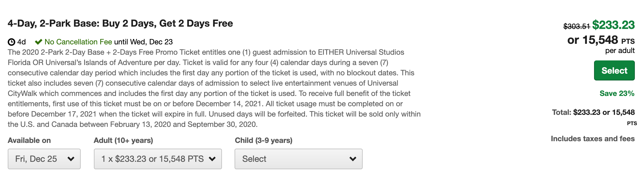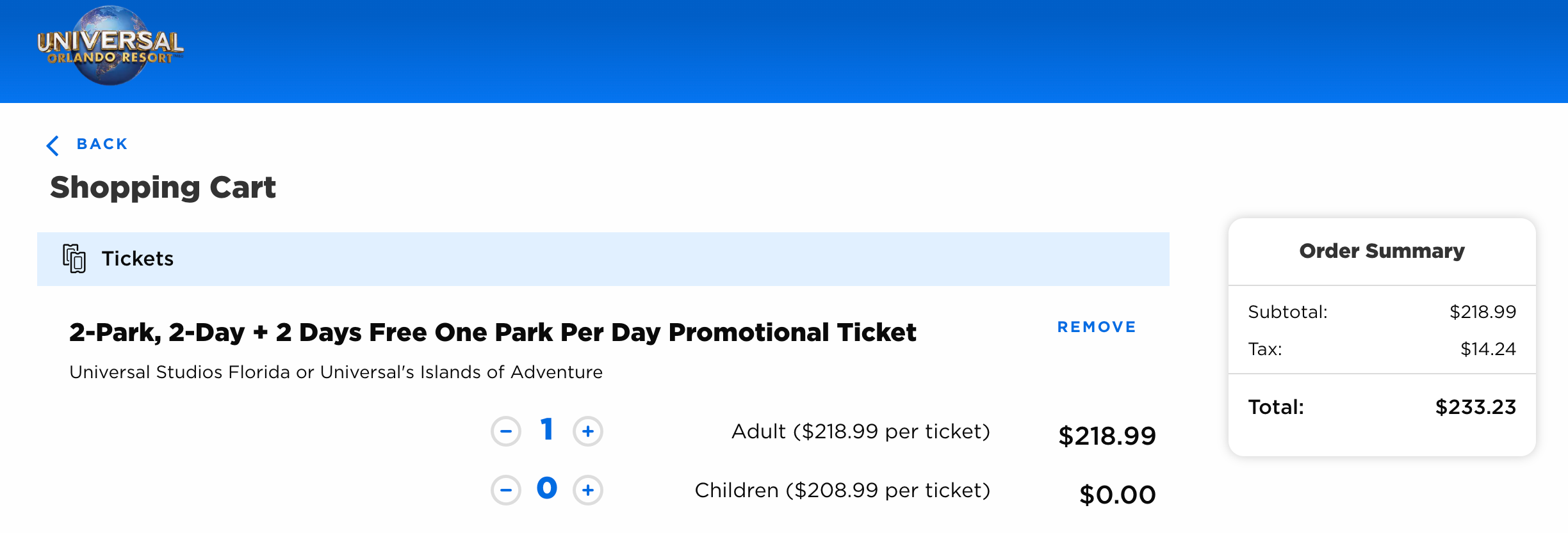 On the flip side, I've also seen times that the ticket prices are exactly the same from the Chase site. The promotional one-park, two-day ticket that comes with two bonus park days costs an all-in price of $233.23 directly from Universal.