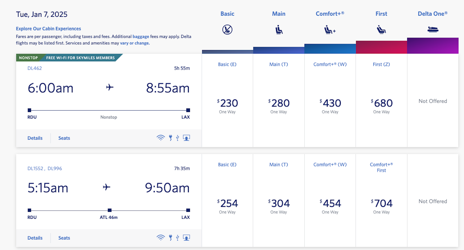 Today, it varies from one flight to another, but the gap is a lot closer. For instance, Delta First comes in at roughly 2 1/2 times the cost of a main cabin ticket on these January transcontinental itineraries from Raleigh-Durham International Airport (RDU) to Los Angeles International Airport (LAX).