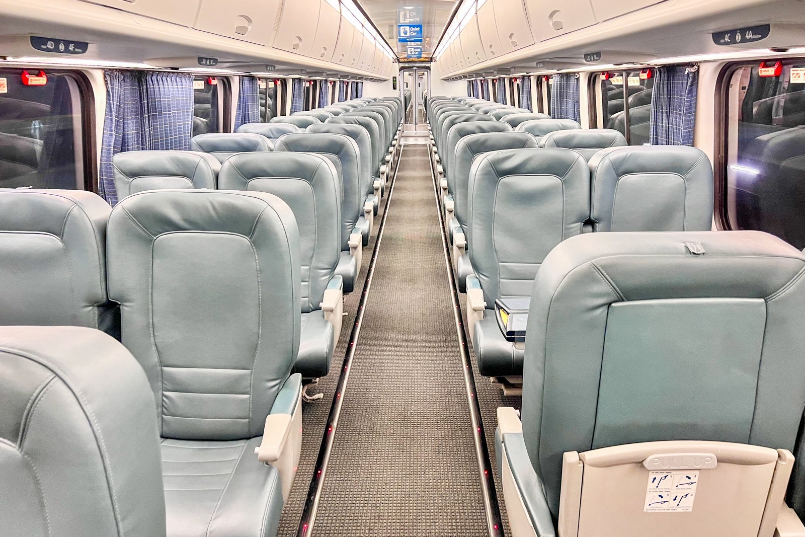 I walked over to check out the adjacent business-class car. The configuration of the first class cabin is a bit different but the seats themselves appear to be the same seat with the same recline. The first class cabin has some single seats available and the pairs of seats have a larger armrest in between them with a bit more spacing.