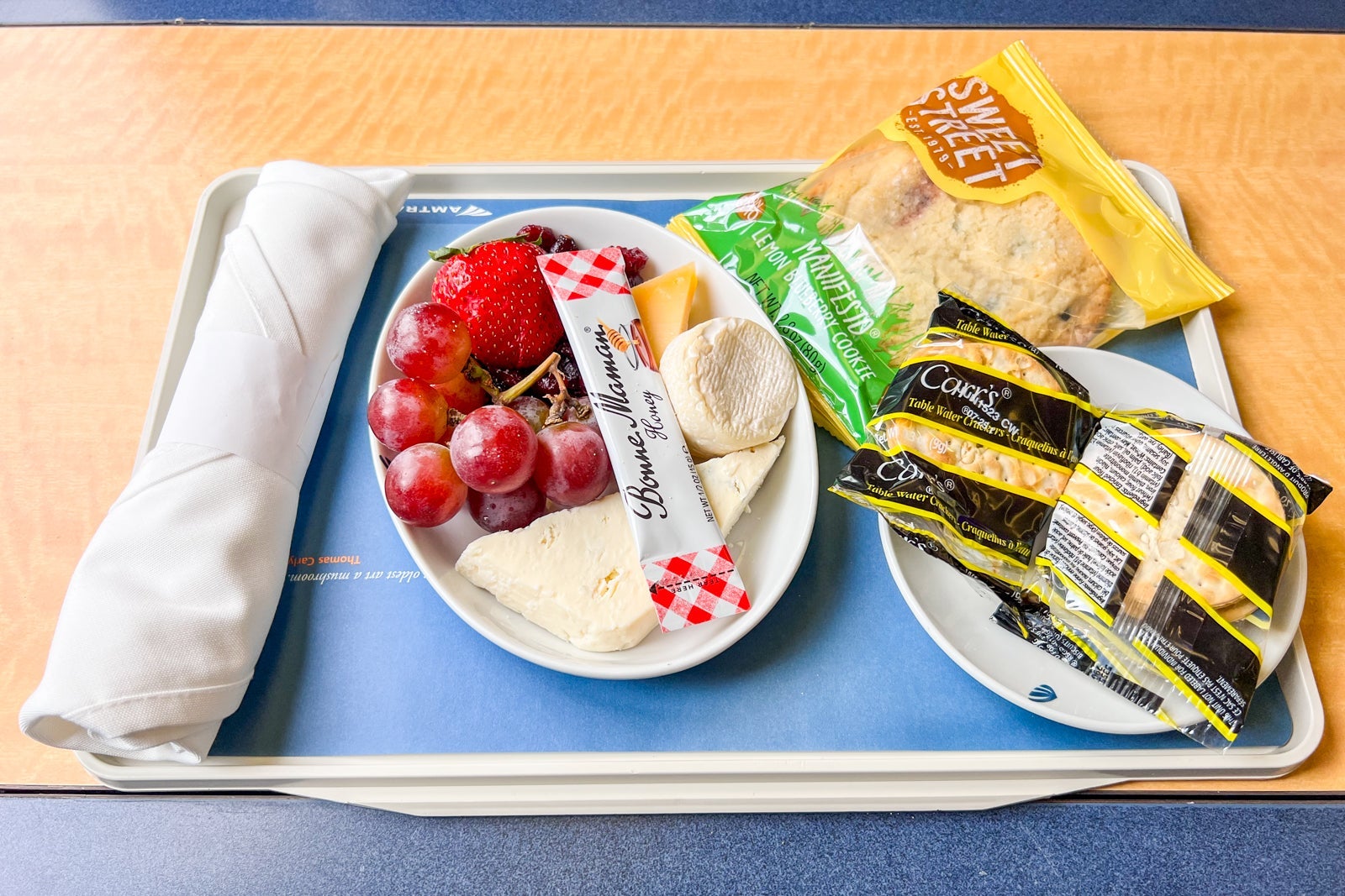Thankfully, a short while later the attendant brought me a cheese and fruit plate as a replacement. I enjoyed the cheese and fruit, but passed on the second lemon blueberry cookie.