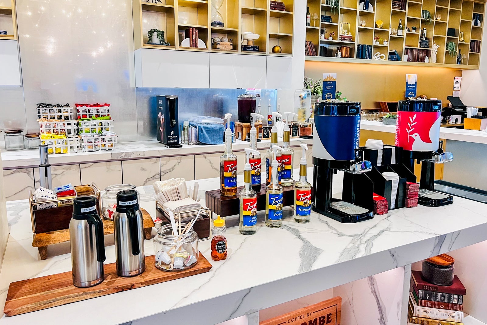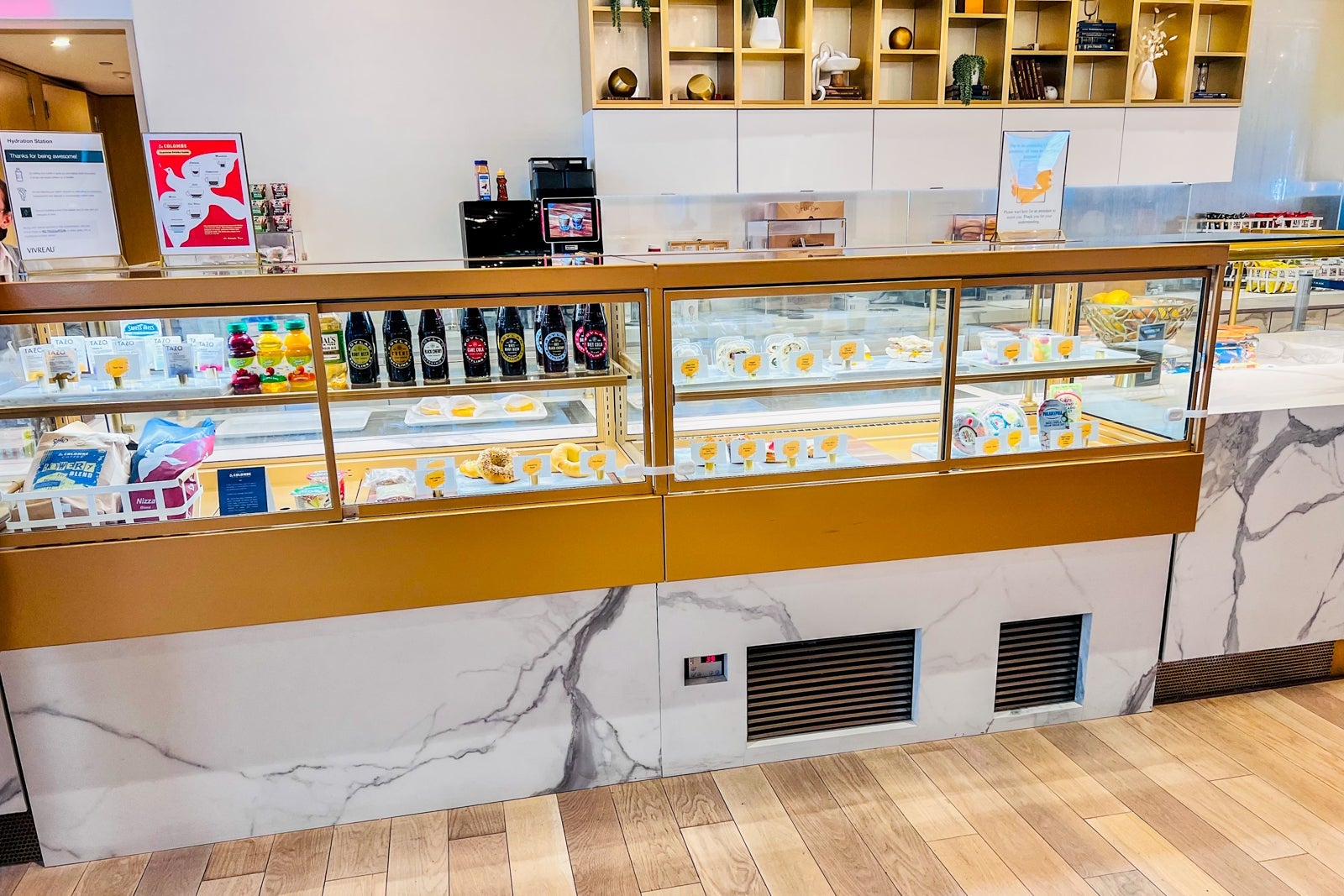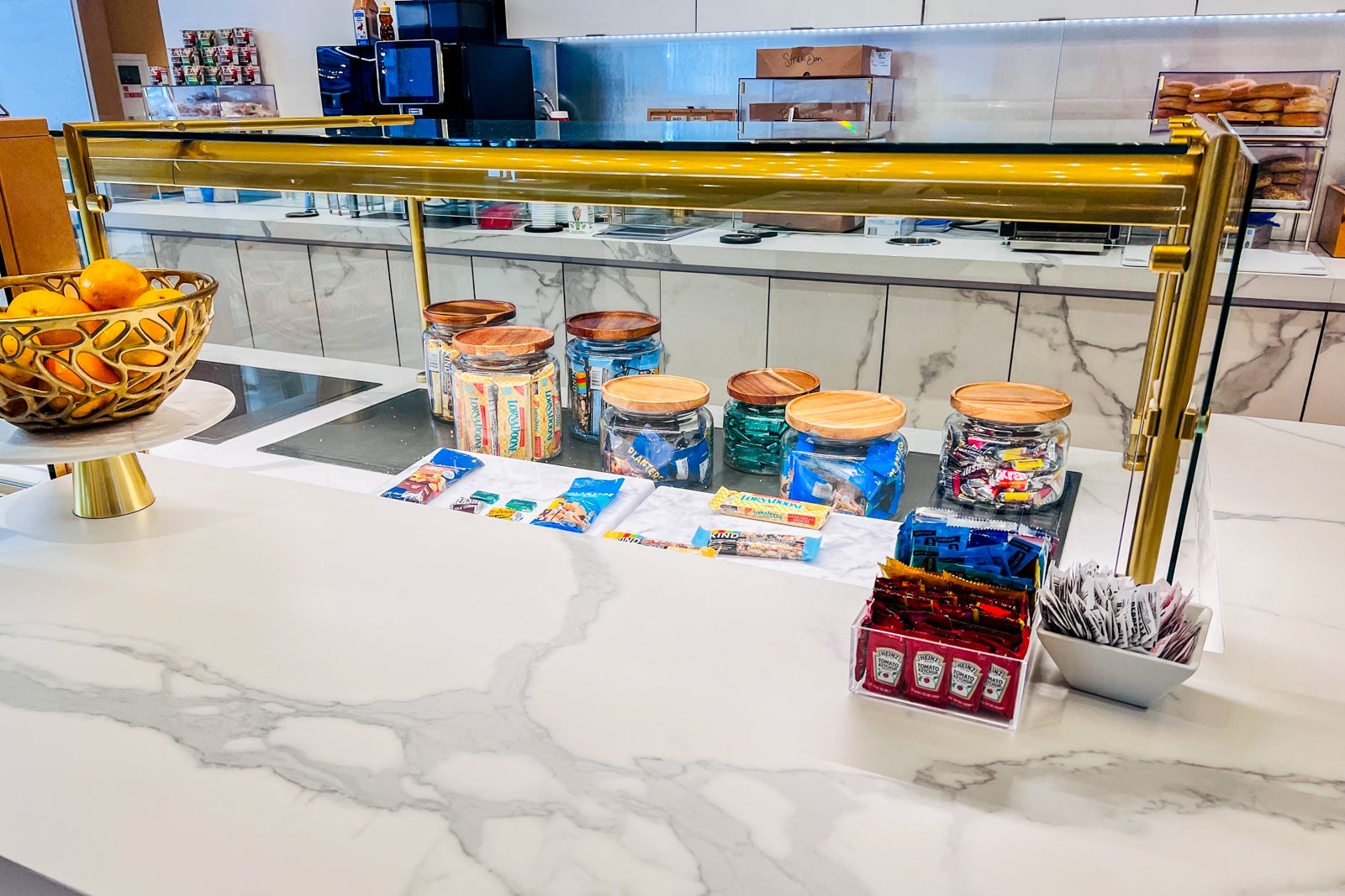 At the far end of the lounge are a number of food and beverage options. The bar area was still closed during my morning departure. The rest of the food and beverage options were a combination of self-service and items prepared by the lounge staff.