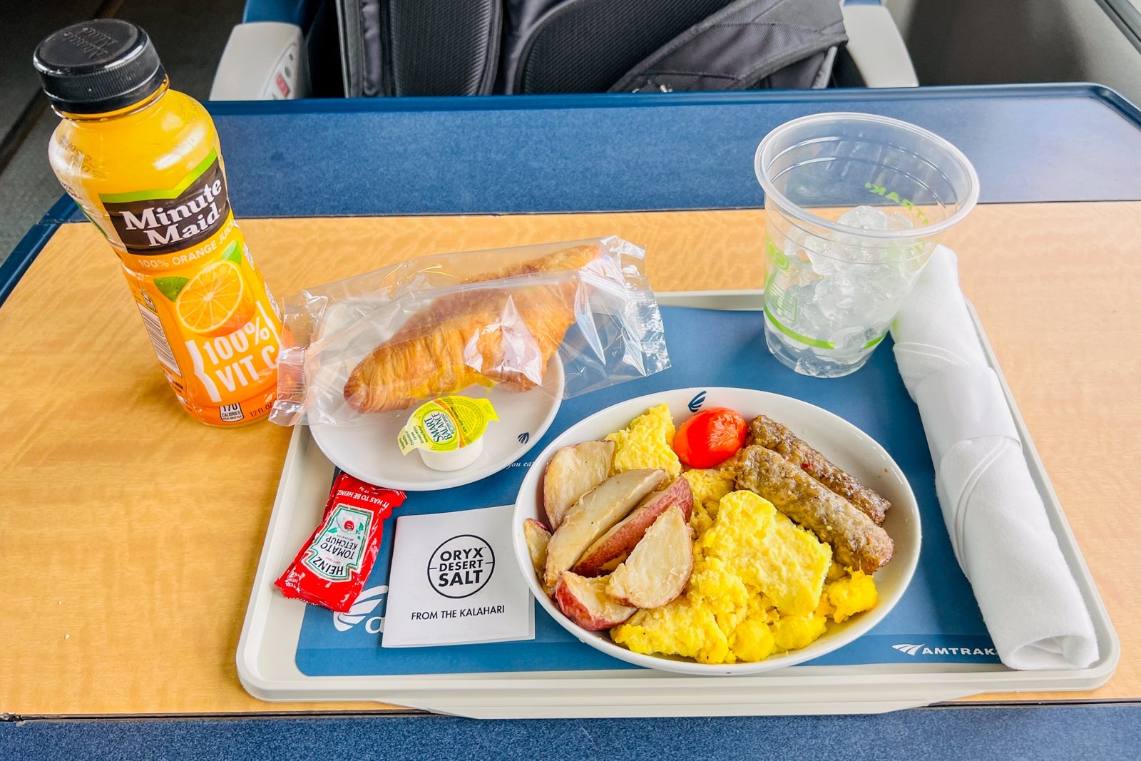 Seasoned business travelers know not to rely on the airlines for high-quality nourishment, and the same rule seems to hold true for Amtrak's first-class cuisine. A freshly prepared breakfast sandwich in the cafe car would have likely been a better option.