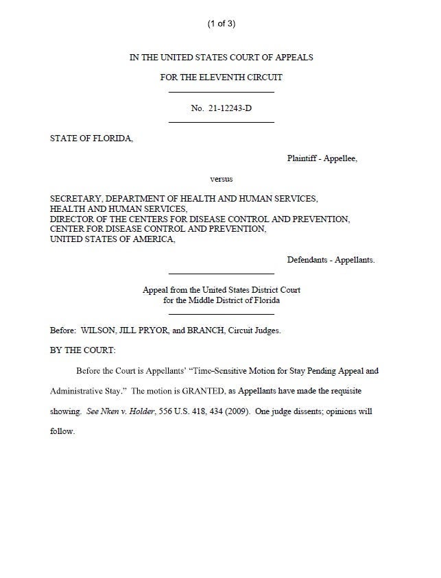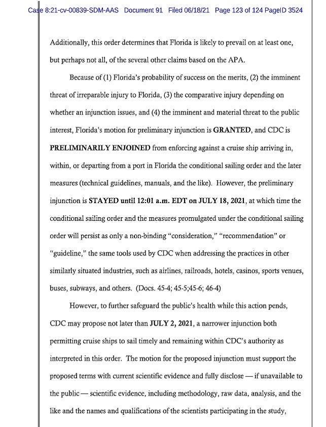 On July 6, 12 days before the conditional sailing order was set to roll back under Merryday's ruling, the CDC and HHS filed an appeal and requested a motion to stay. The U.S. appellate court's granting of the stay essentially freezes rollback of the CDC's cruise requirements until the appeal can be fully heard.