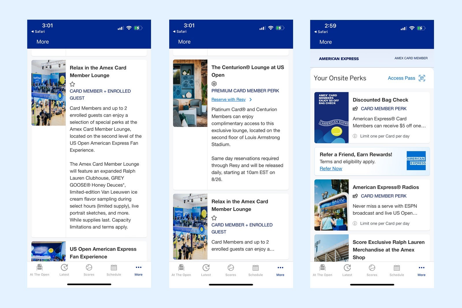 Some U.S. Open perks, like getting a discounted checked bag at security checkpoints, are practical. Other more premium perks, such as access to a pop-up Amex Centurion Lounge, are reserved for select Amex cardholders.