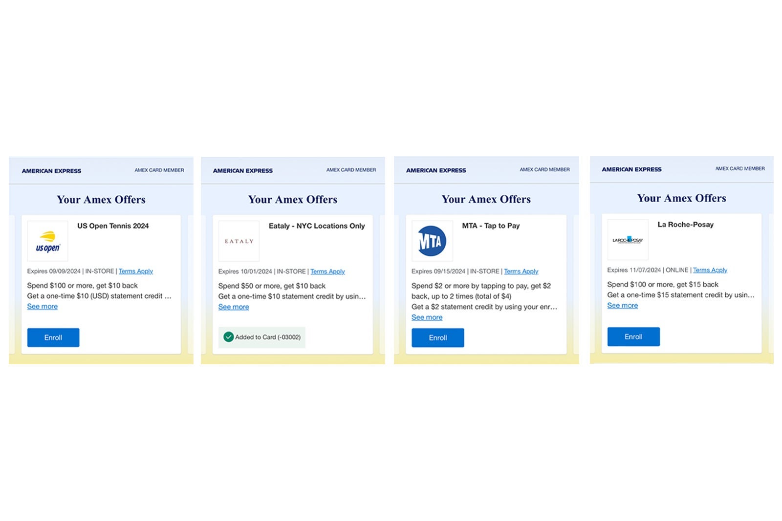 A current Amex Offer provides $10 back after spending $100 on eligible U.S. Open purchases made on-site with an eligible Amex card. To take advantage of this offer, log in to your account to check if the offer is available for your card. If it is, you can add it to your card.