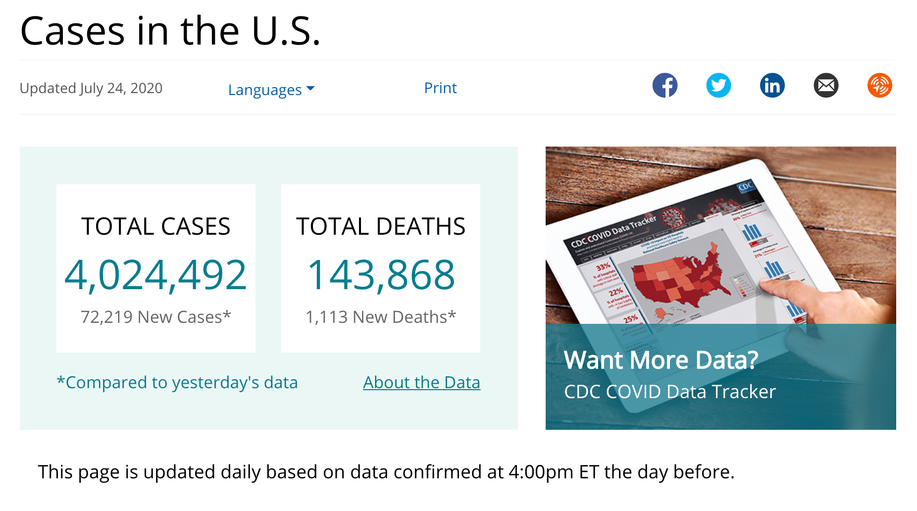 As of today, July 24, U.S. COVID-19 cases have surpassed four million, with 135,000 U.S. deaths due to COVID-19 — an increase of 1.8 million cases and 22,000 deaths since TPG first began reporting case data on June 24.