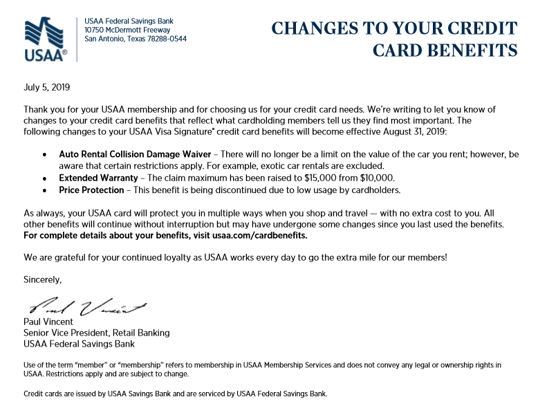 But, Doctor Of Credit reported today — and I was able to confirm via my husband JT's USAA Rewards Visa Signature Card — that the price-protection benefit is ending. Cardholders have been receiving the following letter: