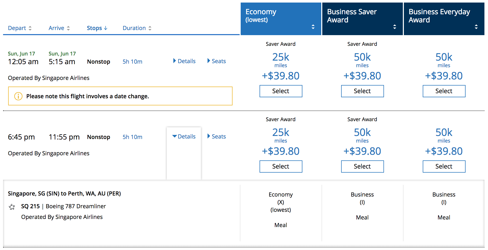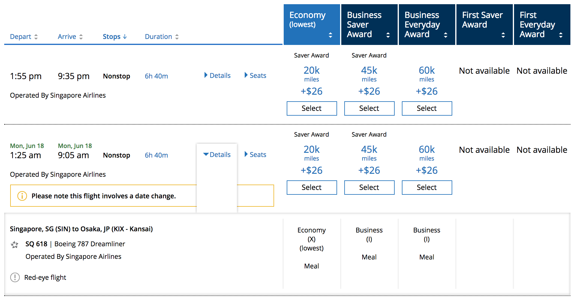 Currently, Singapore is offering the 787-10 on flights between its Changi (SIN) hub and Osaka, Japan (KIX) and Perth, Australia (PER), beginning in May. Lie-flat awards are available to Osaka: