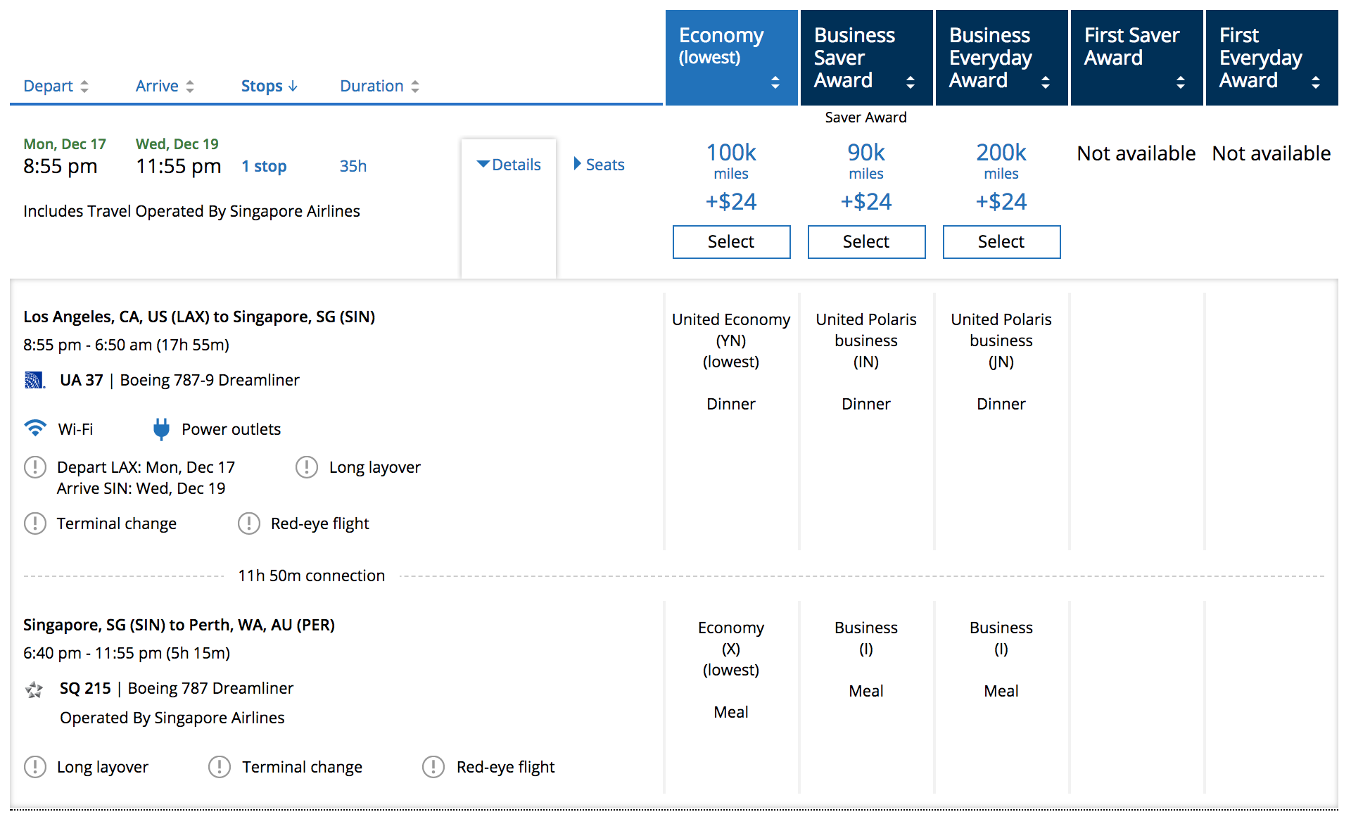 You could also pair these Singapore 787 flights to Australia with a flight from Los Angeles (LAX) or San Francisco (SFO) on United's 787-9, for 90,000 MileagePlus miles each way, though saver availability for that transpacific leg is incredibly difficult to come by.