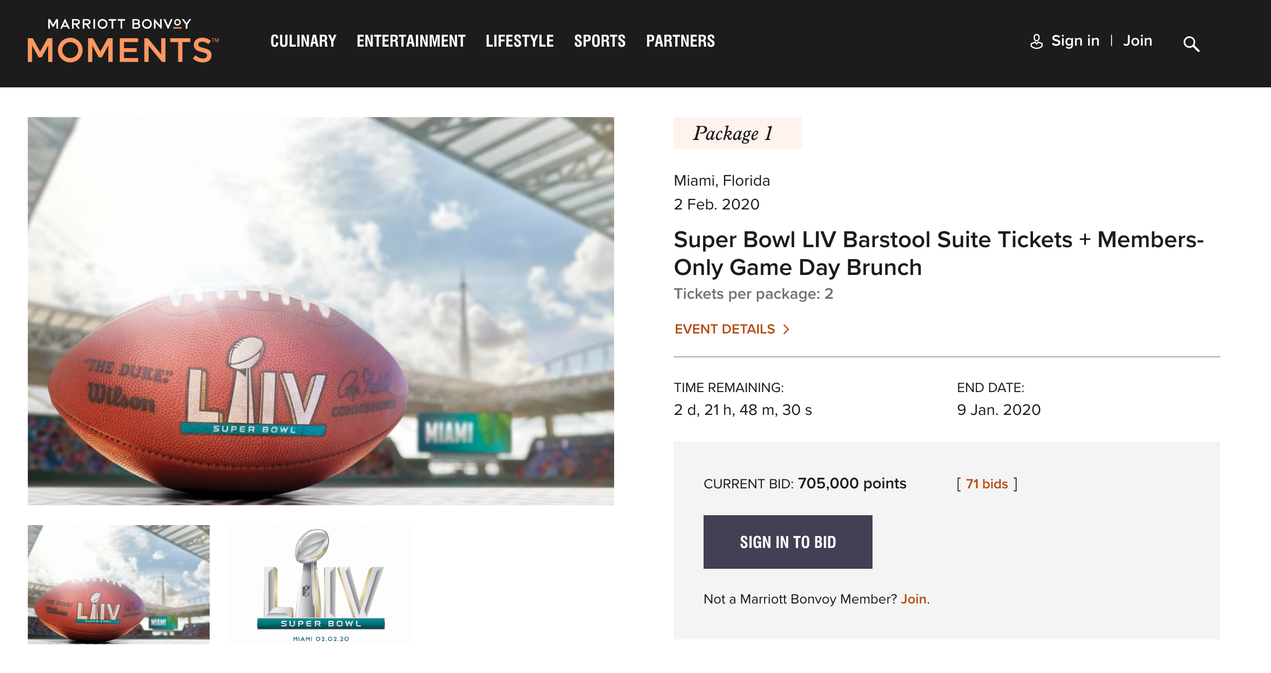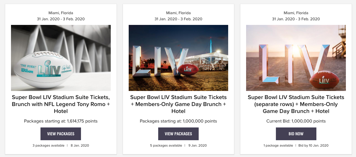 The top-tier package consists of brunch on Feb. 1 with former NFL quarterback turned broadcaster Tony Romo, a game-day brunch, three nights in a Marriott property and two suite tickets in stadium seats to the game, complete with food and beverages. There are three of these packages available and, at the time of writing, the lowest winning bid was 1,614,175 Bonvoy points. These auctions close on Jan. 8, at 1 p.m. Eastern, which means you'll be buying without knowing if your team is in the game.