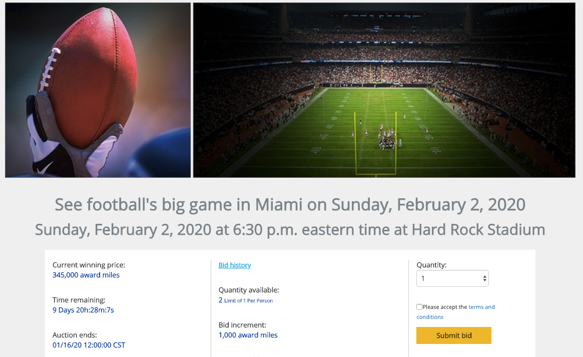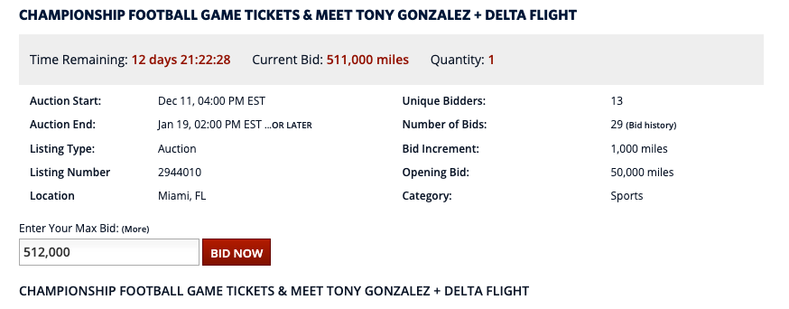 Delta SkyMiles Experiences is auctioning two tickets to the big game, access for two people to meet NFL Hall of Famer Tony Gonzalez and two Delta travel certificates valid for one round-trip economy flight within the continental U.S. and Canada to Miami. At the time of writing, the auction is at 511,000 SkyMiles, with a closing date of Jan. 19 at 2 p.m.