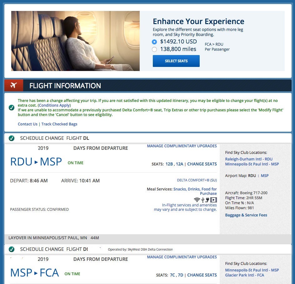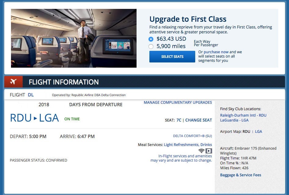 Previously, select tickets purchased with cash would trigger upgrade options when sifting through trips in your Delta.com account. Those upgrades were only purchasable via more cash until today.