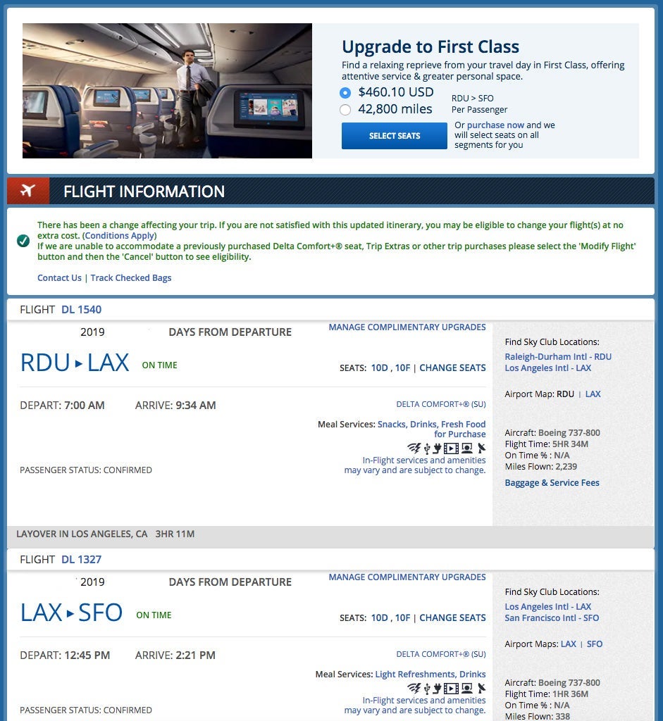 Of the six upcoming Delta round-trip itineraries in my account right now, five of them are eligible to move from either Main Cabin or Comfort+ into the First Class cabin via cash or SkyMiles — the latter of which wasn't an option yesterday. It's worth noting that the SkyMiles buy-up option doesn't discriminate between paid bookings and award bookings. I have a mix of both coming up, and Delta is more than happy to accept miles or cash on either to upgrade my seat.