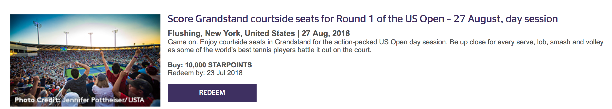 Two courtside tickets US Open to the matches at Louis Armstrong Stadium start at 15,000 SPG points for the pair of tickets. Grandstand courtside seats start at 10,000 SPG points for a pair of tickets.