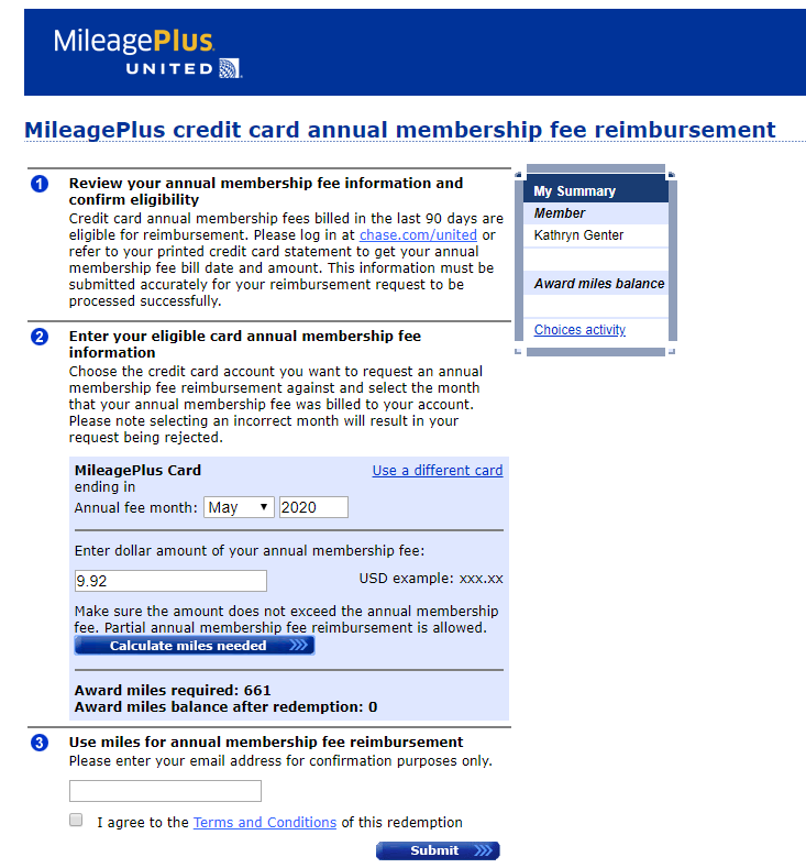 One interesting aspect is that partial annual membership fee reimbursement is allowed. This means that you can use any number of miles. For example, I could zero out my United mileage balance by redeeming all 661 miles for a $9.92 reimbursement toward my annual fee.