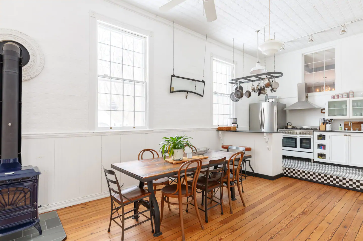 This rustic property was a 19th-century schoolhouse in its previous life and is now equipped with modern amenities — and even a pool. It has been converted into a three-bed, two-bath home that can fit up to six guests.