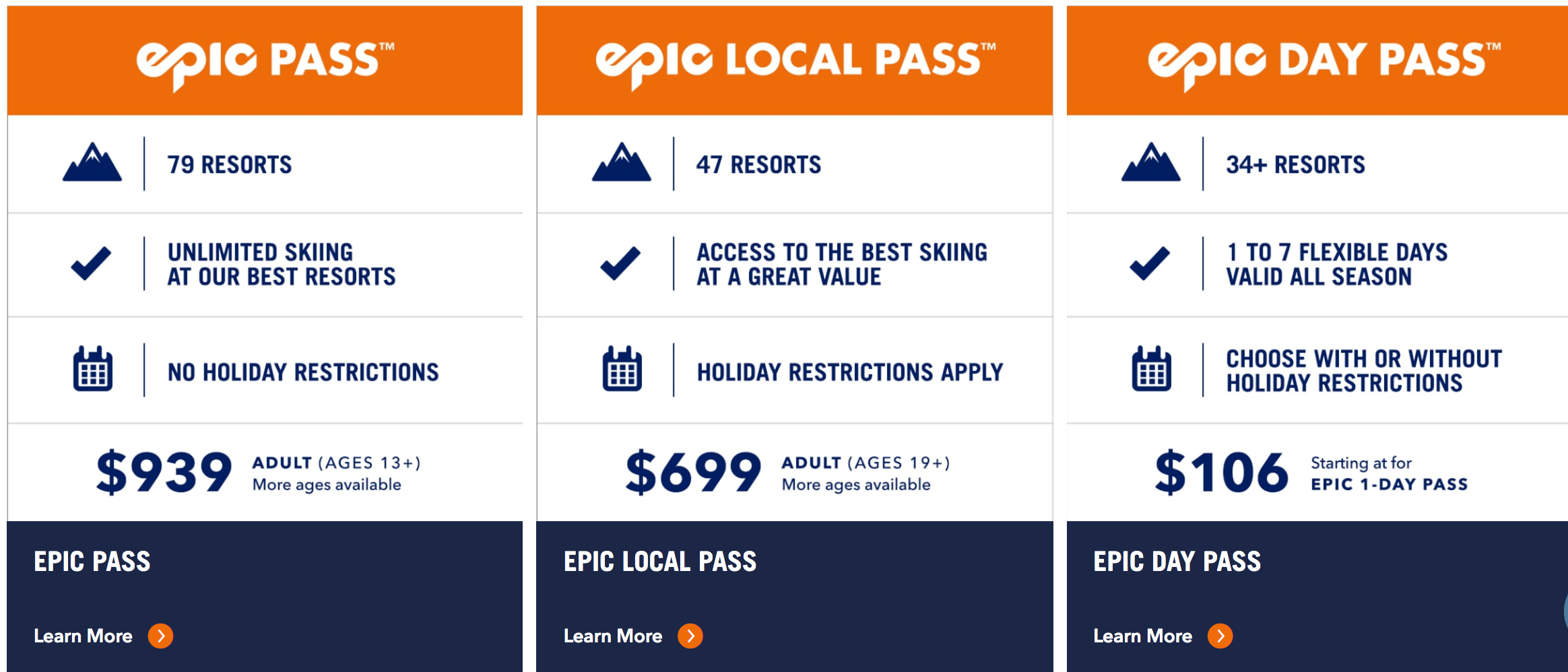 The Epic Pass is by no means cheap, but with 79 resorts now included you might find it be the most economical way to ski this winter. There are several flavors of passes available ranging from the full Epic Pass to the Epic Local Pass and even Epic Day Passes (a total of one to seven ski days).