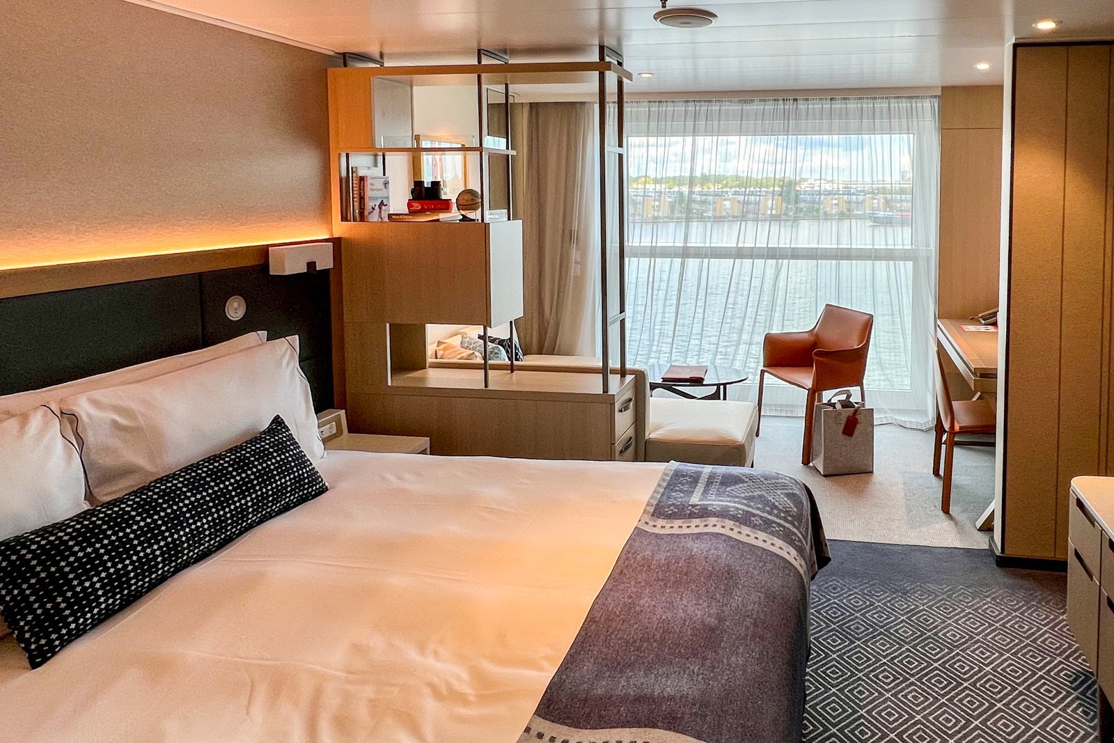 In another first for a polar expedition cruise vessel, every cabin on each vessel has floor-to-ceiling glass walls that slide partially open from the top to create a balcony-like feel.