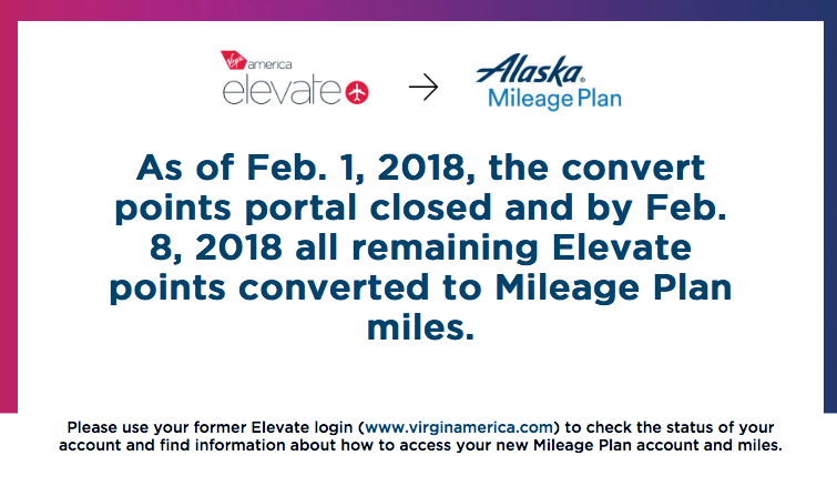 While the Virgin America Elevate program officially ended on December 31, 2017, it was still possible to transfer any remaining Elevate points to Mileage Plan with a 30% bonus via a transaction on Points.com. As of Thursday, February 1, 2018, that portal has closed for Elevate members to transfer their points to Mileage Plan.