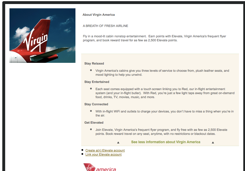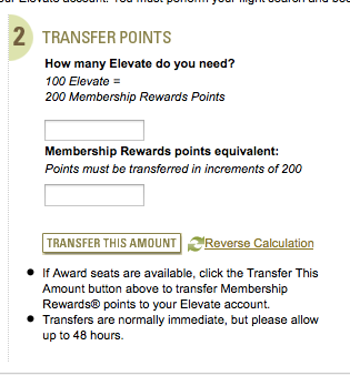 And unfortunately the ratio is 100 Elevate = 200 Amex, so a disappointing 2:1 ratio. This is not a great deal because Elevate is a fixed value loyalty program, which mean you can redeem points for any flight and they are worth between 1.6 and 2.1 cents each towards airfare. So if you transfer Amex to Virgin America, you are valuing your Amex points at .8 and 1.05 cents a piece, which is very low. I conservatively value mine at 2 cents a piece and you can purchase points directly from Amex for 2.5 cents.