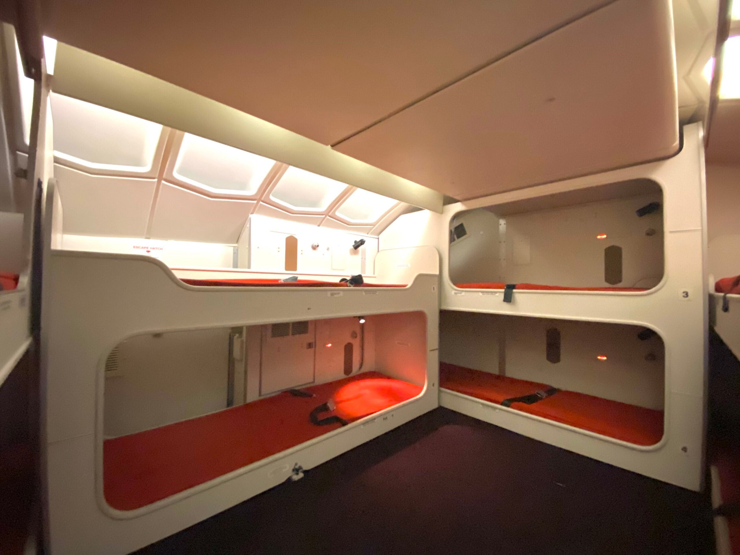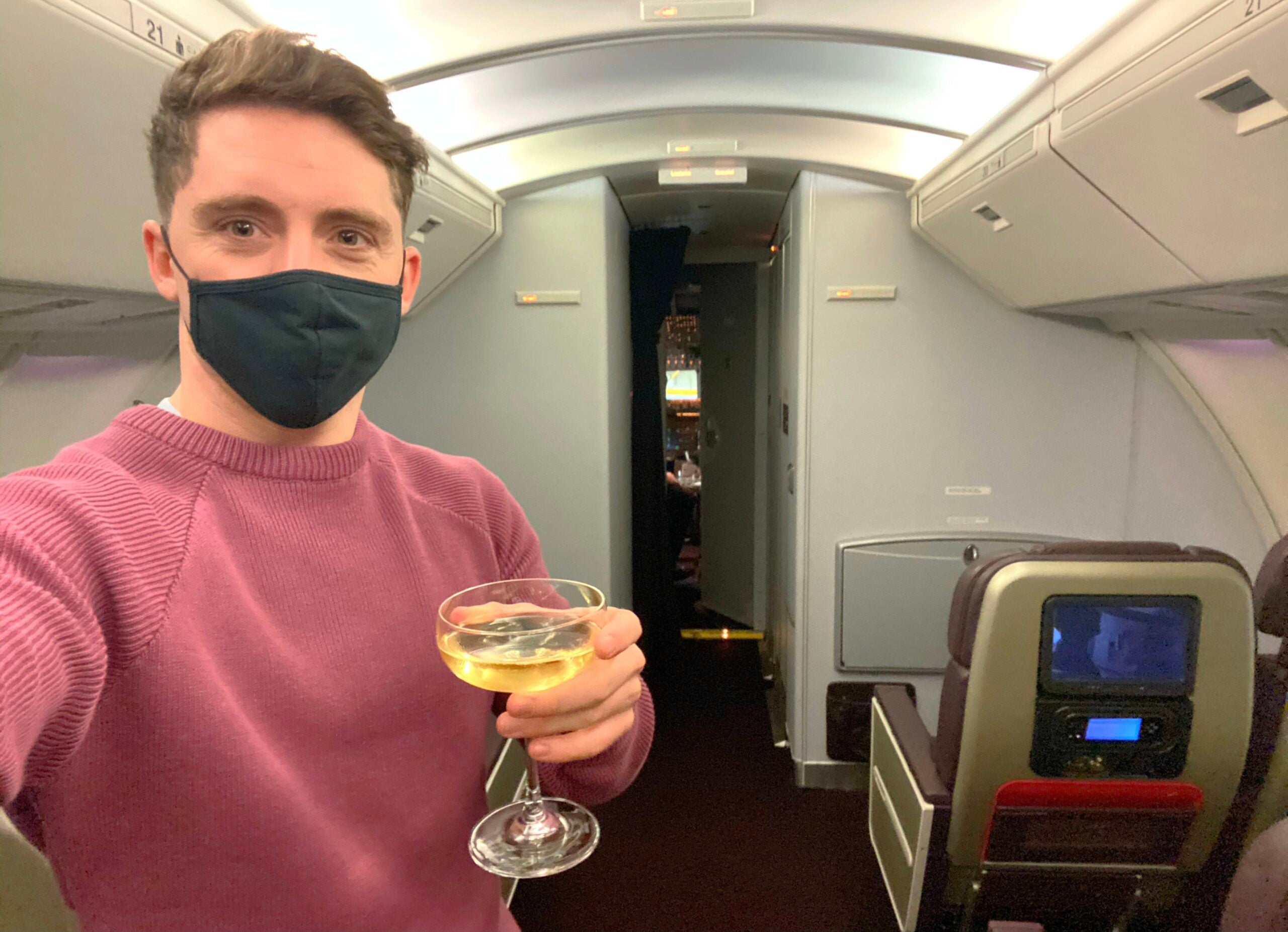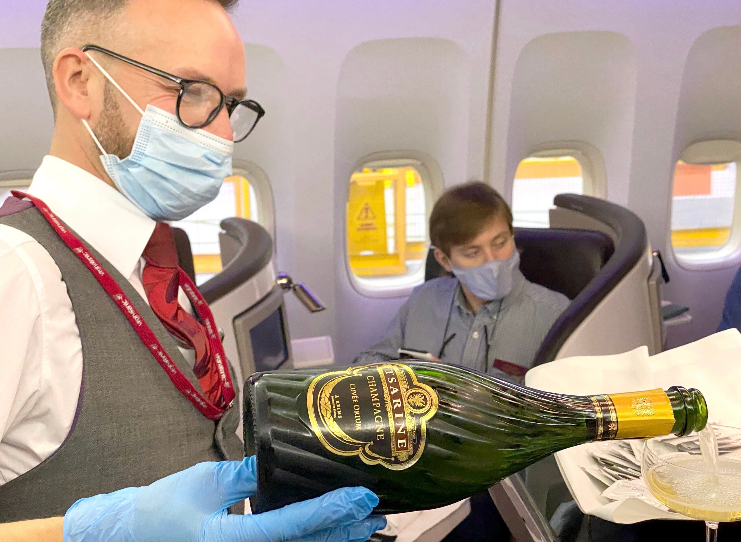 Passengers flying Premium on Virgin's 747 were able to do just that, as there's a small section of the cabin upstairs at the front of the bubble where guests were served Champagne as a welcome drink.