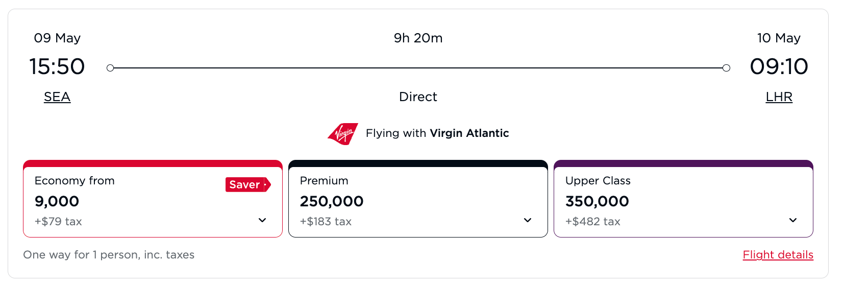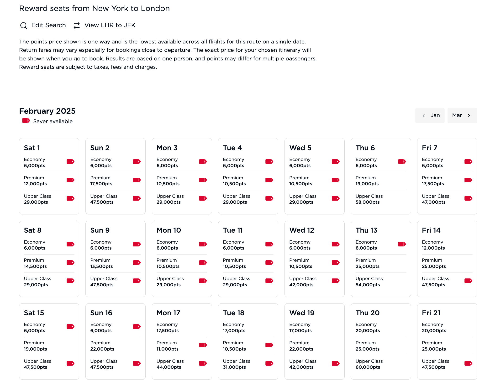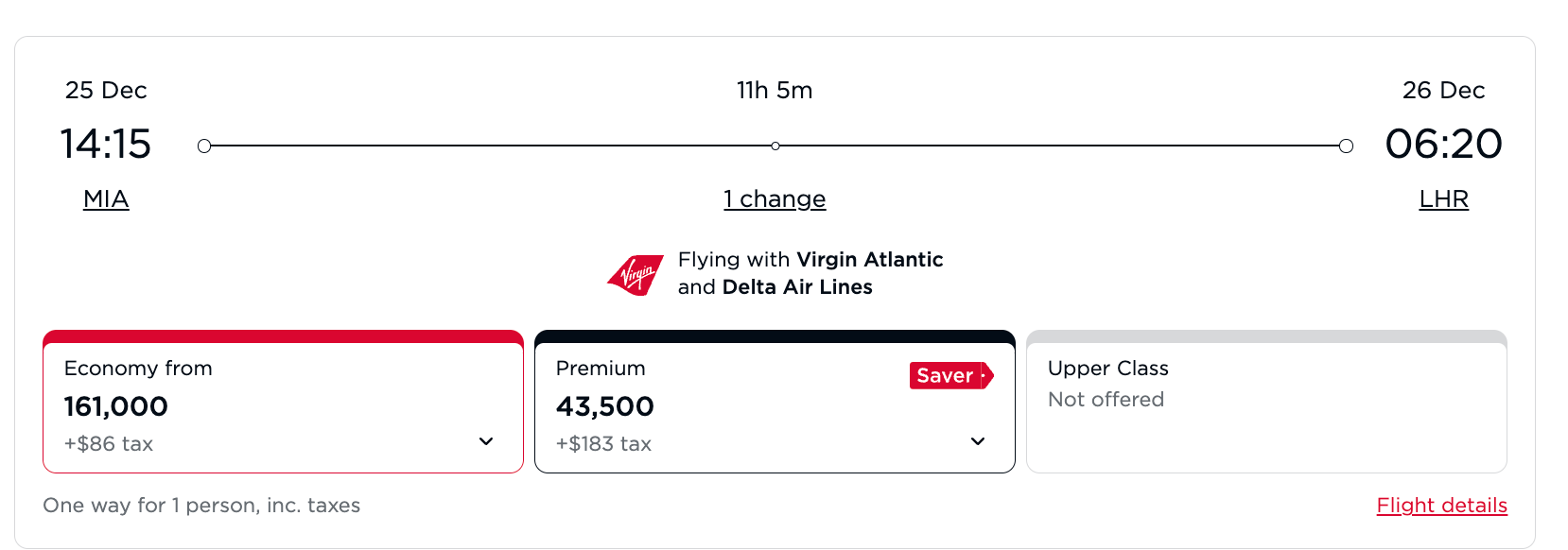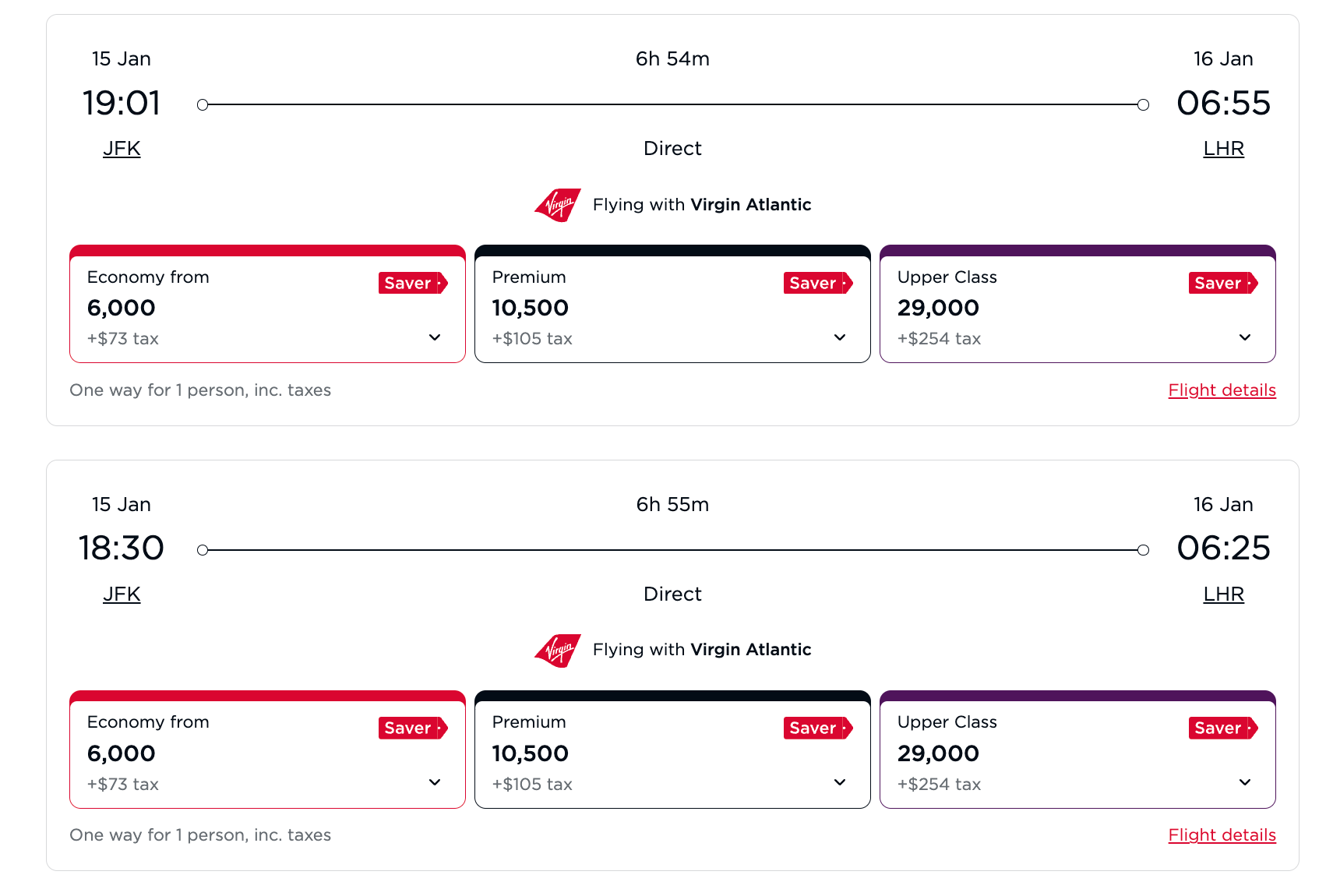 While the availability of these flights is limited (look for the red "Saver" tag when booking), prices start from as low as 6,000 Virgin points in economy from John F. Kennedy International Airport (JFK) to Heathrow Airport (LHR), 10,500 Virgin points in premium economy and just 29,000 Virgin points in business class.