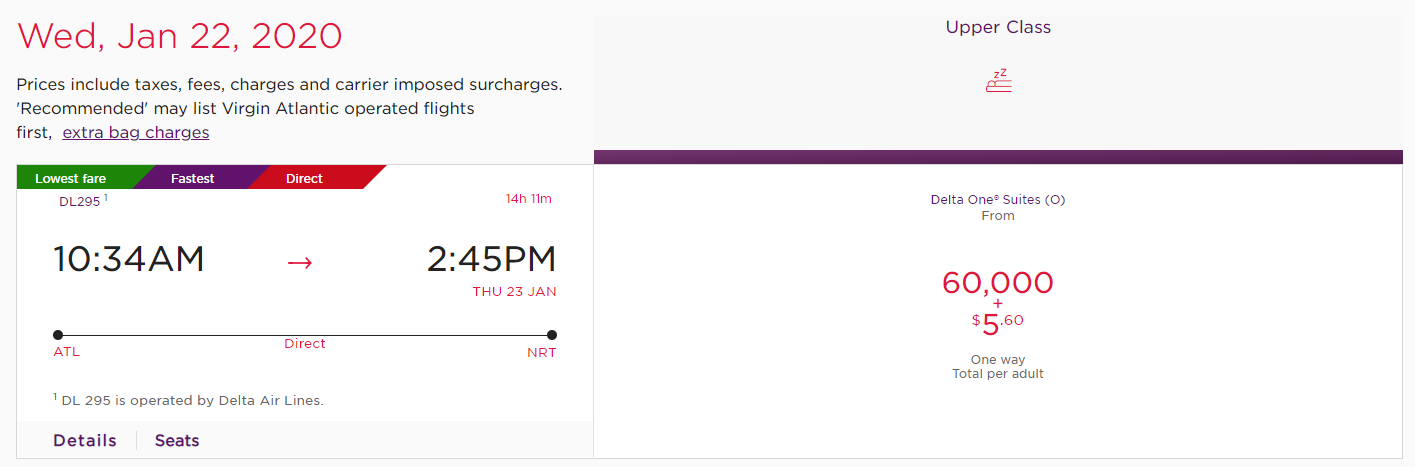 Instead, you're going to want to use your Flying Club miles on partners like Delta (e.g. Delta One Suites to Europe for 50,000 miles + $5.60 one-way or Delta One Suites to Asia for 60,000 miles + $5.60 one-way) and ANA (e.g. first class U.S.-Tokyo from 90,000 miles). Yes, that means that you can fly Delta business class for 14+ hours for just 60,000 miles and $5.60 out of pocket: