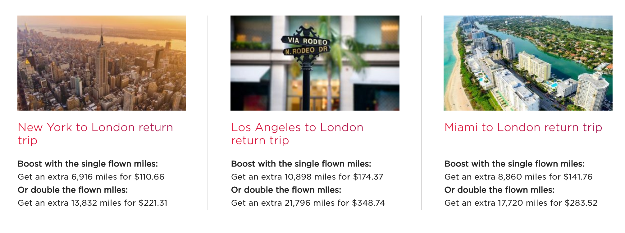 - Travelers can generally choose a "single" or "double" boost. The single option lets you buy the number of flight miles for the trip (i.e. 6,916 miles for a round-trip from New York City to London). Or you buy 2x that amount by choosing the double option. During this promotion, Virgin Atlantic is also offering a triple boost.