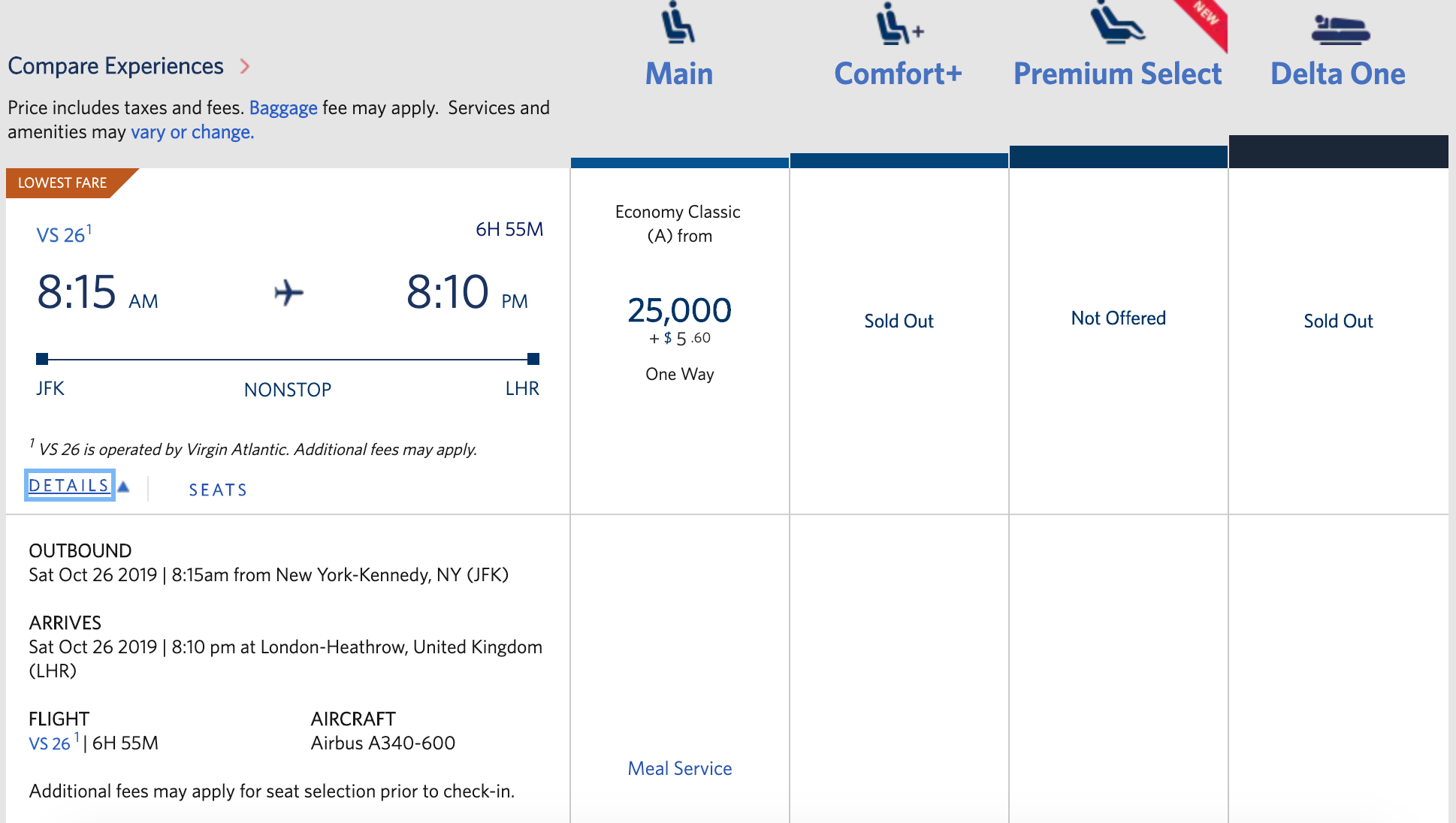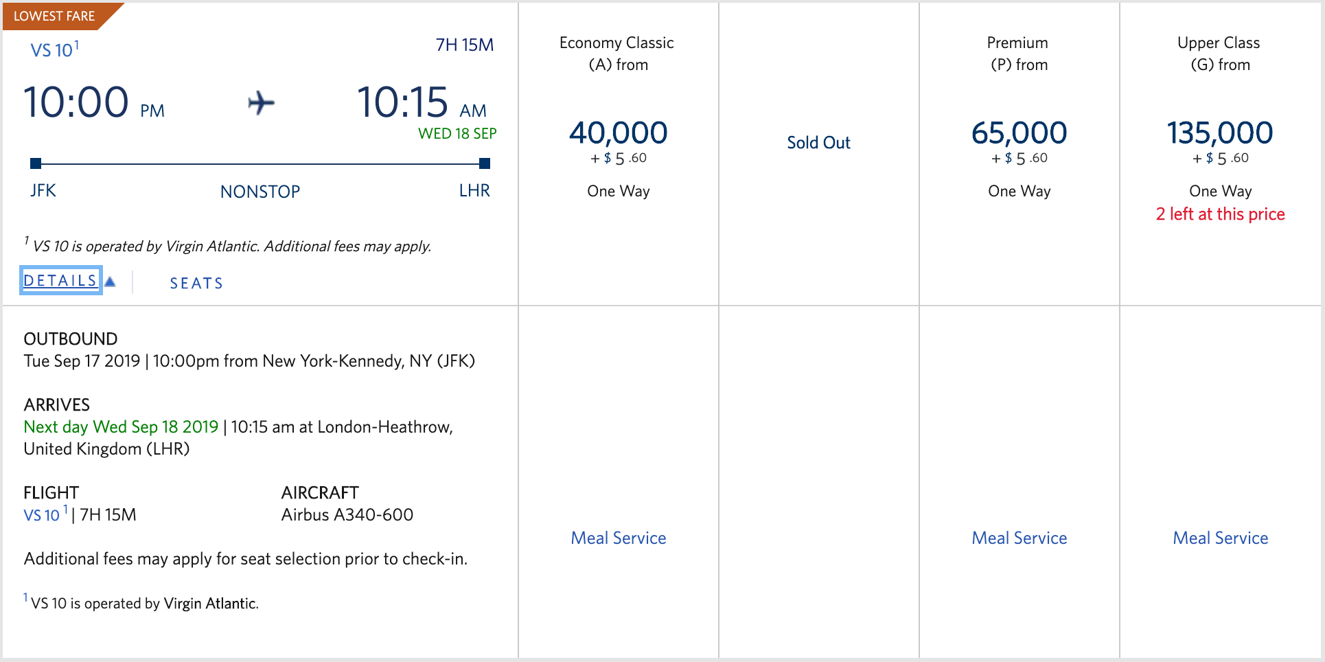 With Virgin Atlantic's final A340 flight not until late October, you may be able to find some reasonably priced off-peak award flights when booking with Delta SkyMiles. Here are a few award flights TPG found during a quick search.