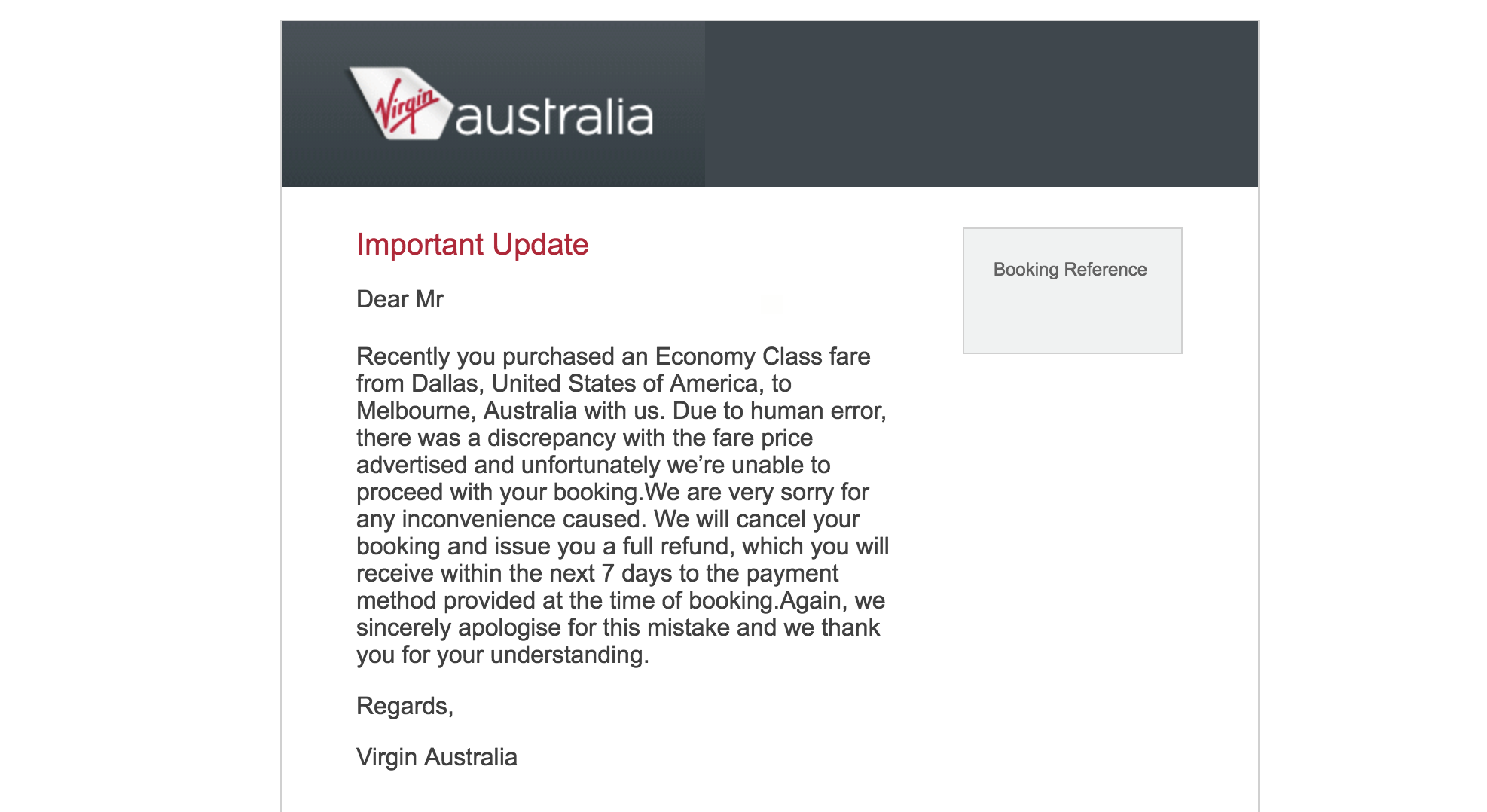 As it turns out, the $174 round-trip mistake fare from the US to Australia was, in fact, too good to be true. As reported by several TPG readers, Virgin Australia is emailing those who purchased tickets, informing them that it's not proceeding with their booking.