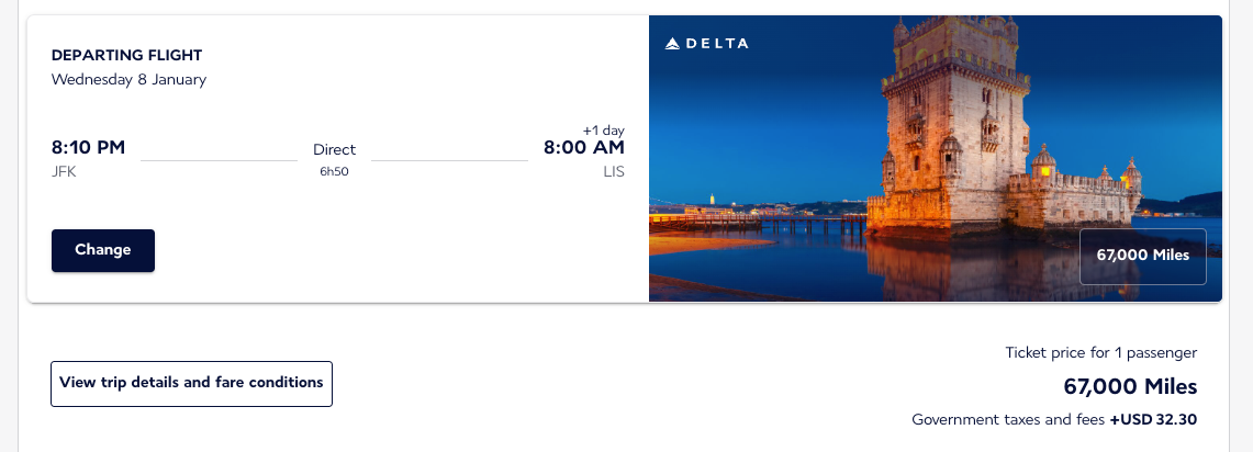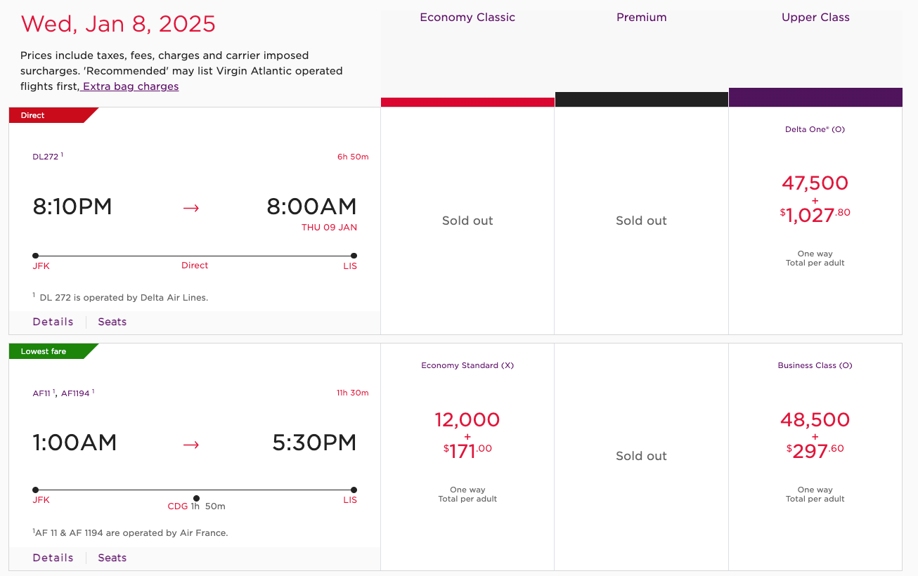 For example, one of the only options I found during my search for Delta One availability to Europe over the next 12 months is from JFK to Portugal's Lisbon Airport (LIS). Though it will cost you less than 48,000 Virgin points, you'll pay over $1,000 in taxes, fees and surcharges.