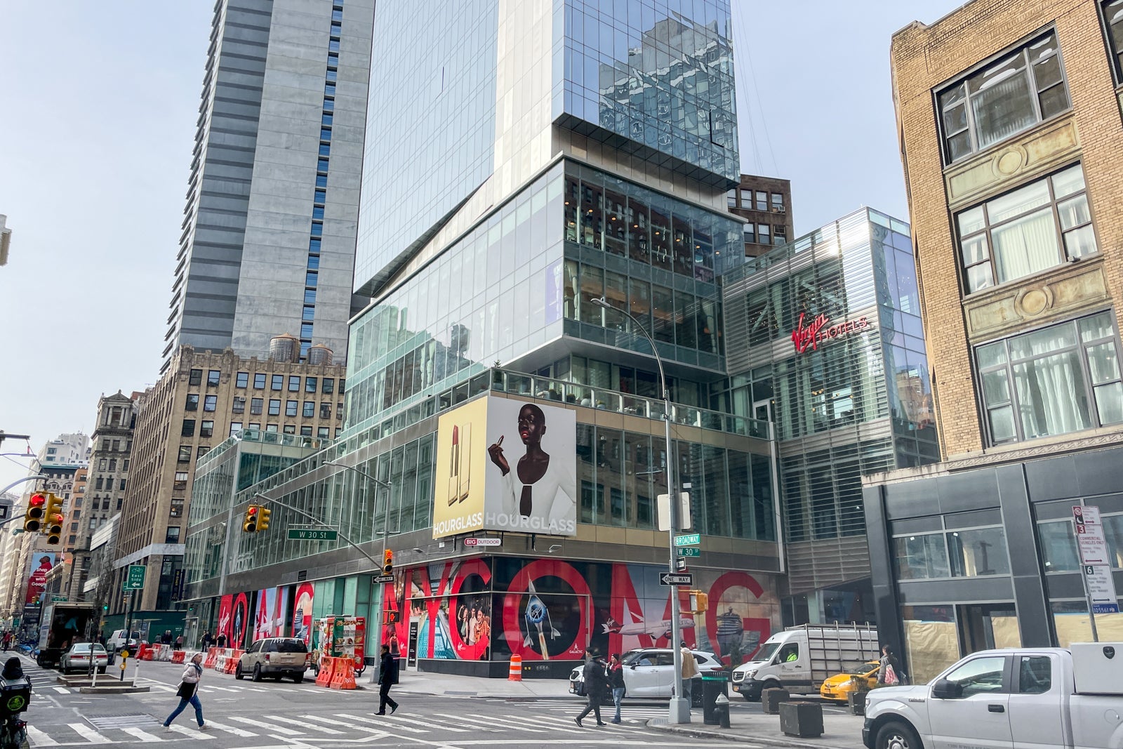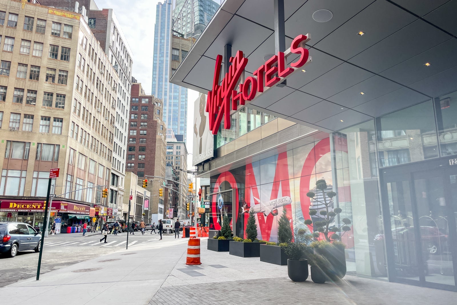 The massive building juts into the sky from Broadway between 29th and 30th streets (a prime location to reach most of the city's iconic tourist attractions). The new hotel is slightly set back from the street, with a modern portico welcoming guests with the iconic Virgin logo hanging overhead.