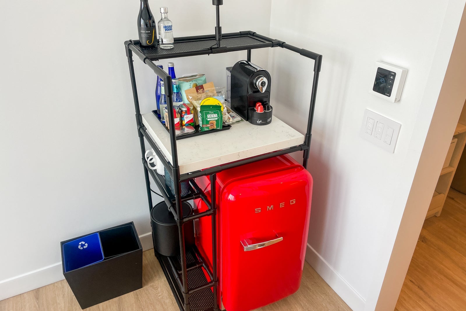 The Lounge is designed for work and rest, so guests will find a smart TV, an ergonomic bed with a backboard-like attachment at the foot for lounging, a red (it's everywhere!) Smeg minifridge and bar area stocked with local treats at "street" prices, a yoga mat and more.