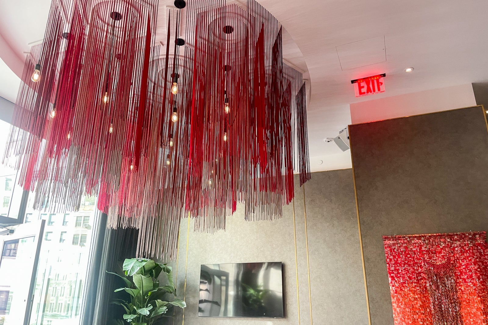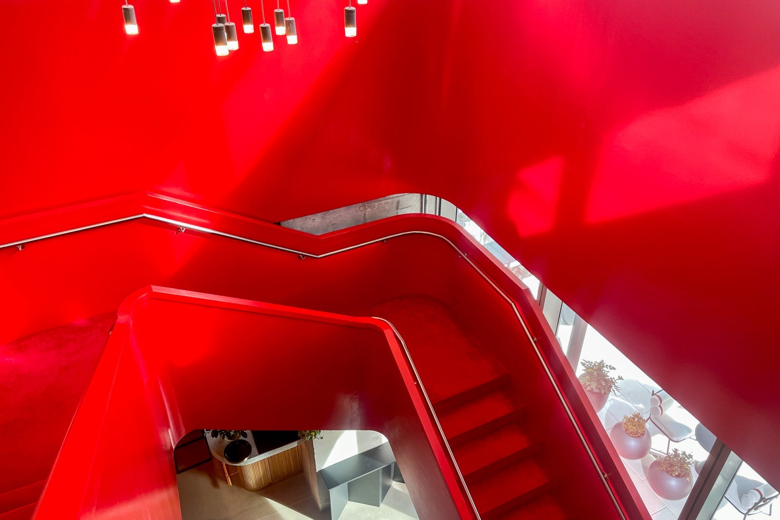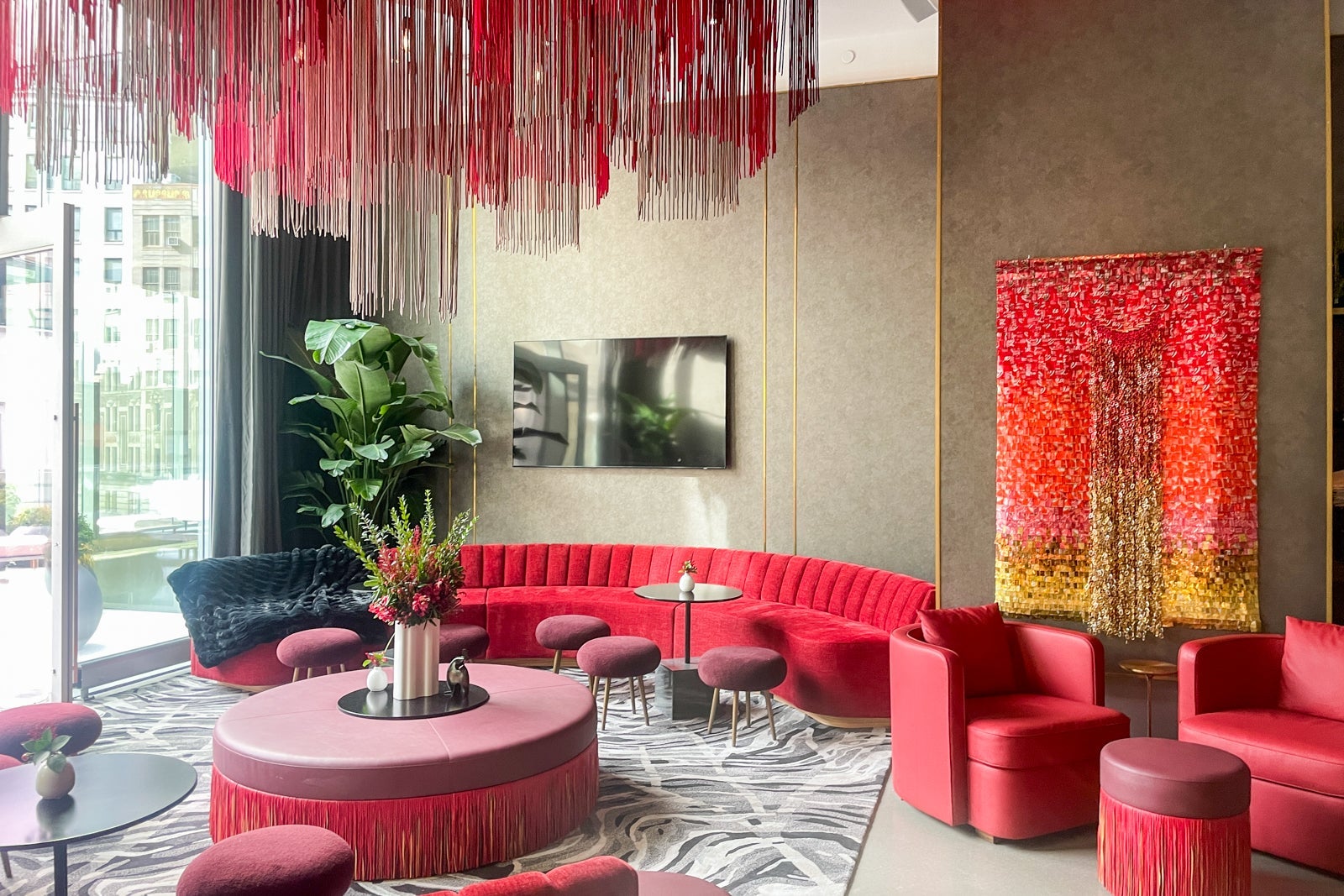 As a whole, the large hotel's public spaces are bright and airy. The decor features pops of color against industrial elements like exposed concrete — and of course, there are plenty of sharp reds, the brand's signature color. You can see the red on display in the lounge area, where a dramatic and dreamy curved red couch and hanging red fringe ceiling installation are showstoppers.