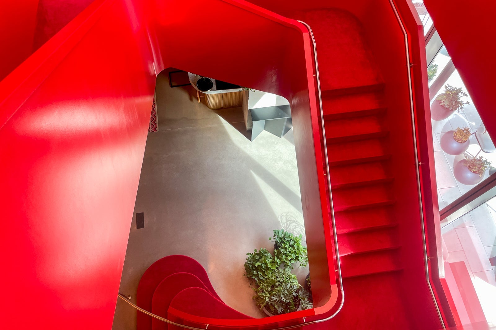 It's sure to be one of New York's most Instagrammable new hotels; two spots stopped me in my tracks for a must-take photo. First, a larger-than-life, totally dramatic red staircase connecting the third and fourth floors. Seeing it, I couldn't help but imagine a modern take on "Cinderella" where a red-bottom Louboutin (instead of a glass slipper) is left behind before the clock strikes midnight.