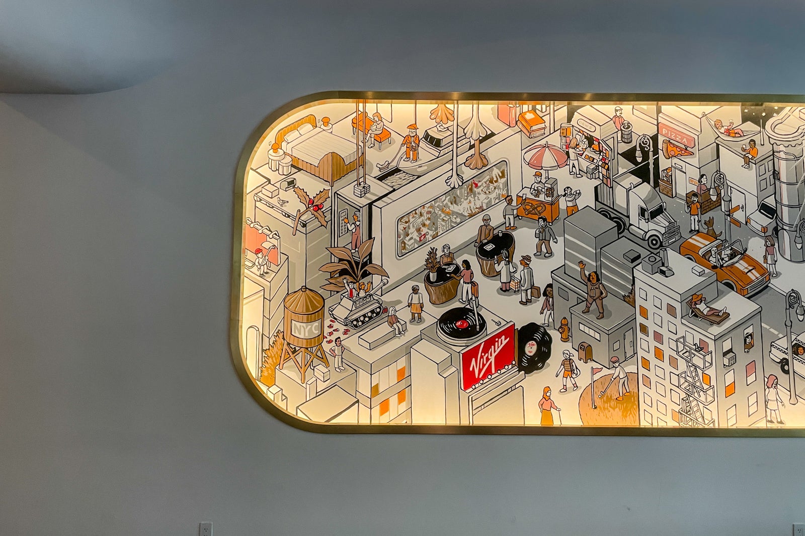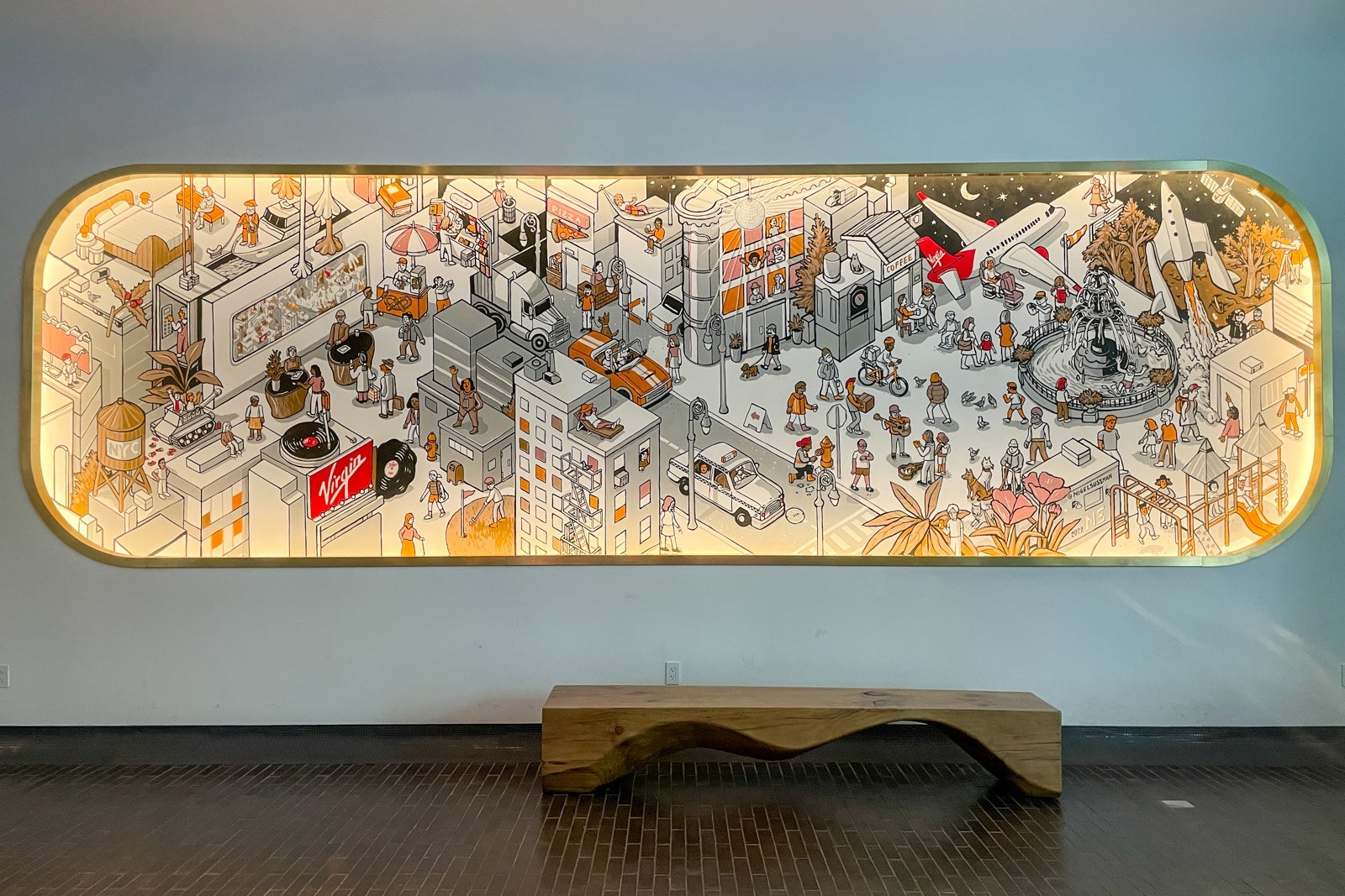 On the opposite wall, the large space is centered around a massive mural, "Where's Richard?" by California-based artist Nigel Sussman. The cheeky mural is a play on the "Where's Waldo?" book series, but instead of Waldo, keep your eyes out for hidden images of Richard Branson — the force behind the Virgin empire.