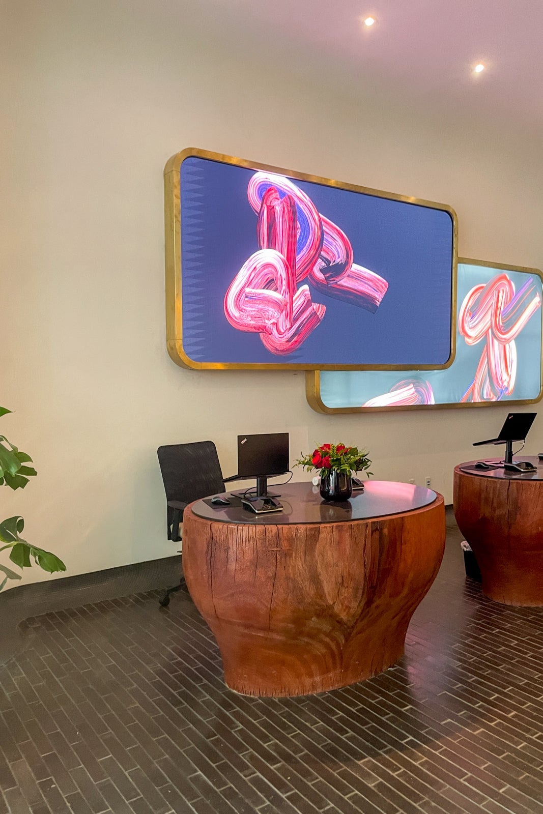 Inside the automatic sliding doors, guests are greeted by a subdued lobby with massive wooden reception desks and two large digital frames.