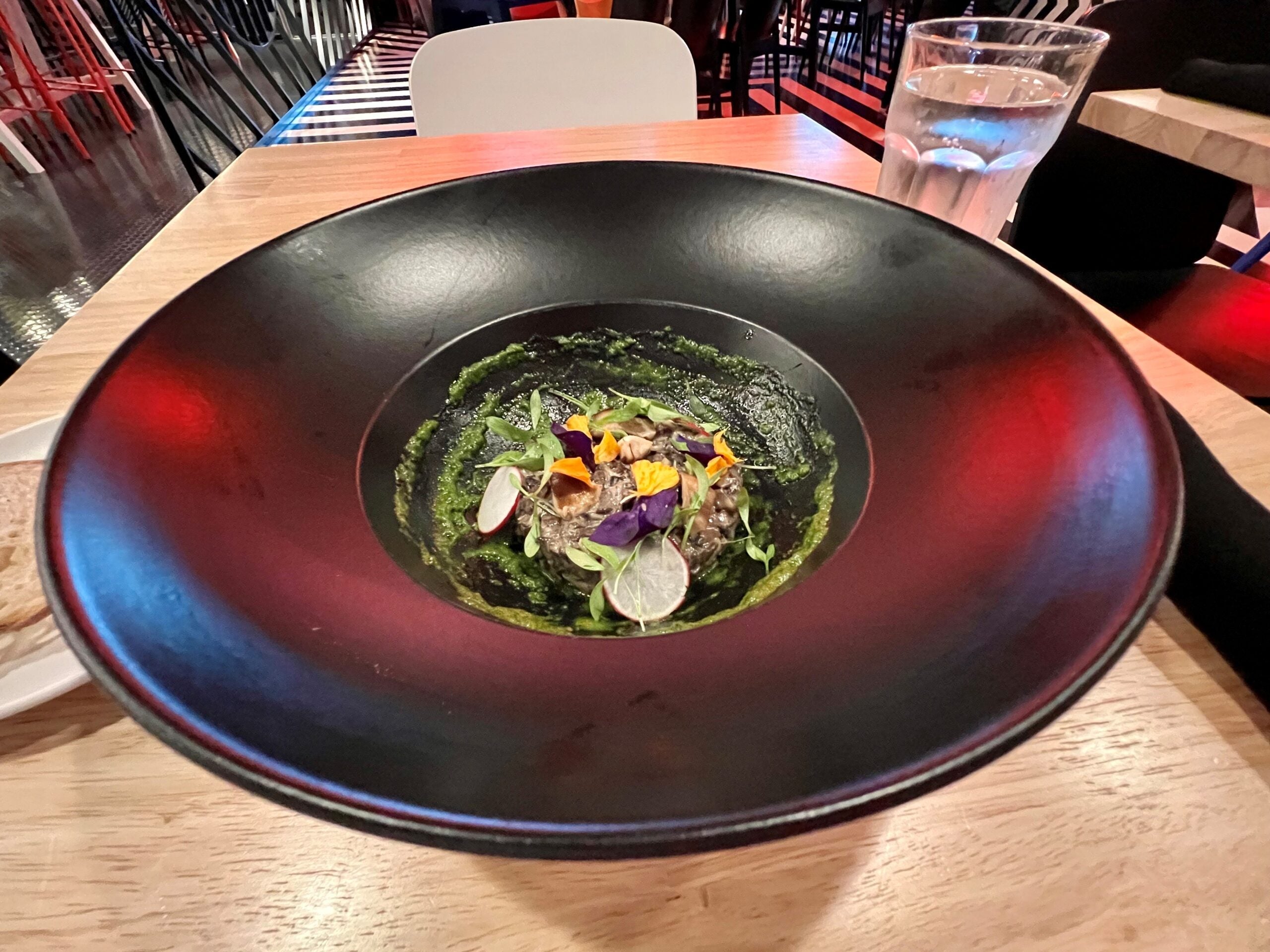 I also liked the purple sweet potato and coconut ice cream that came with the vegetarian "rainbow churros" dessert, although the churros themselves were covered with so much (red, green and blue) sugar that anyone who eats the whole thing runs the risk of a serious sugar rush. I took one bite.