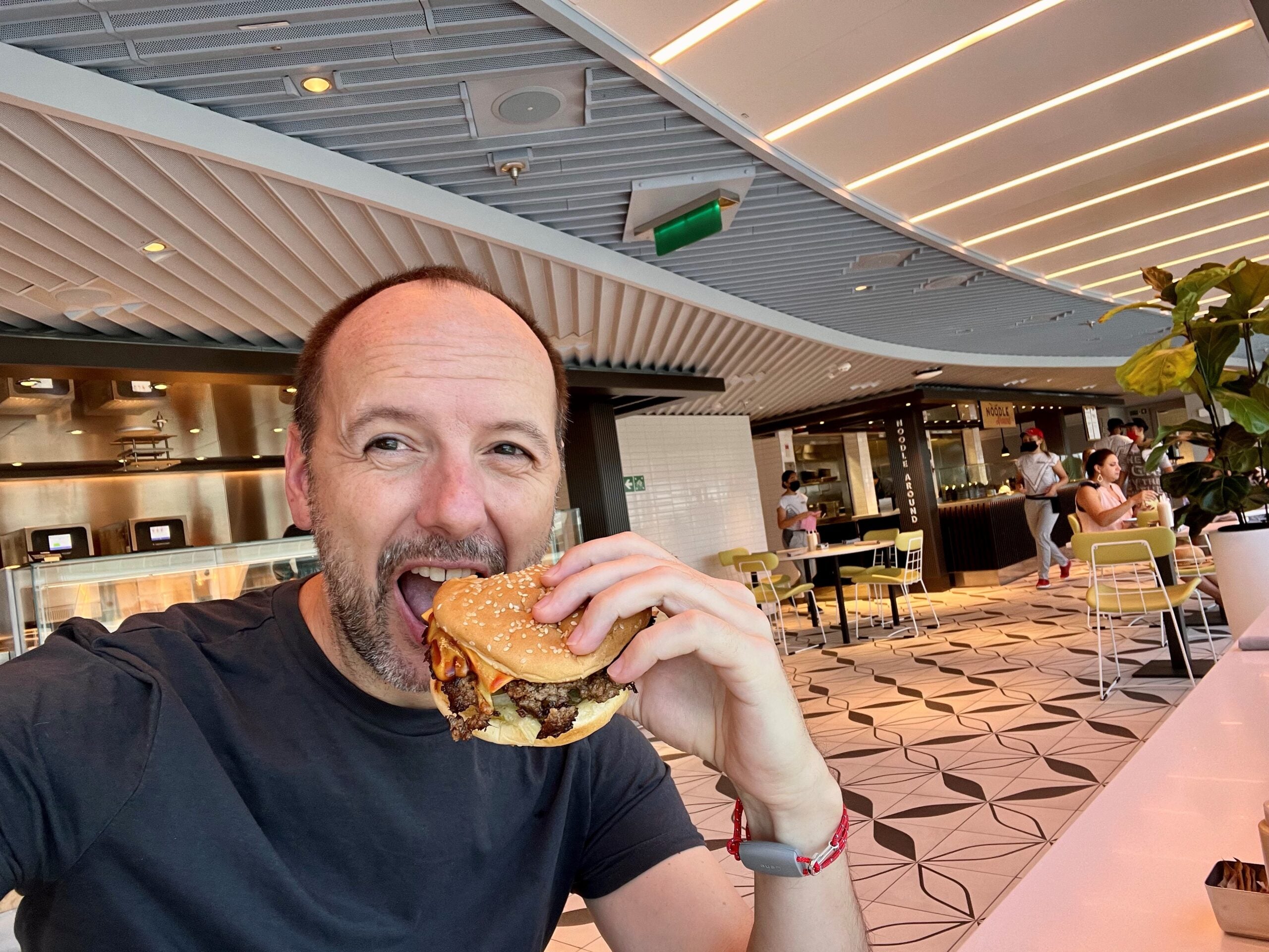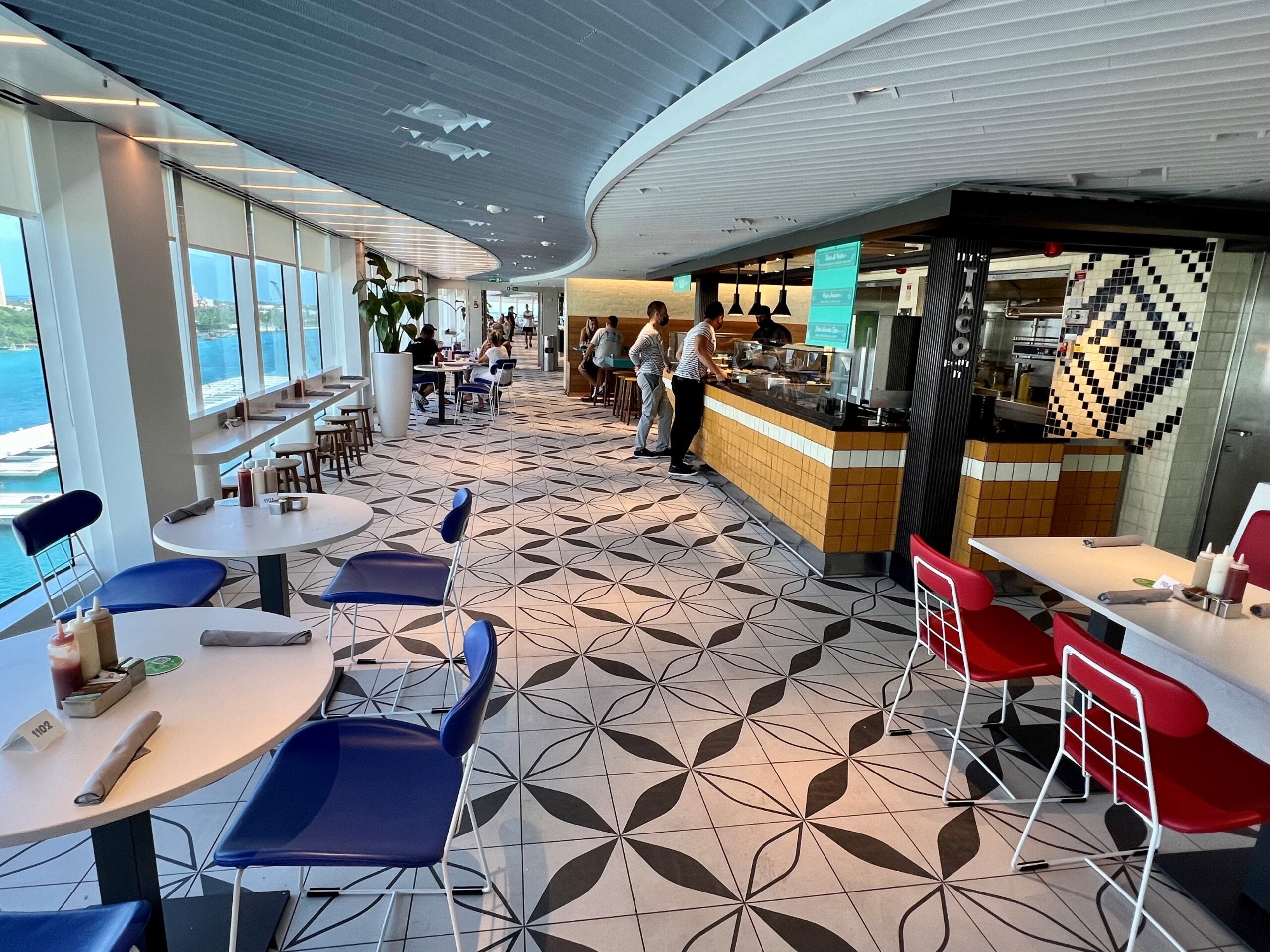 As I write this, I am sitting in a sprawling, casual food court at the top of a cruise vessel that looks suspiciously similar to a cruise ship buffet.