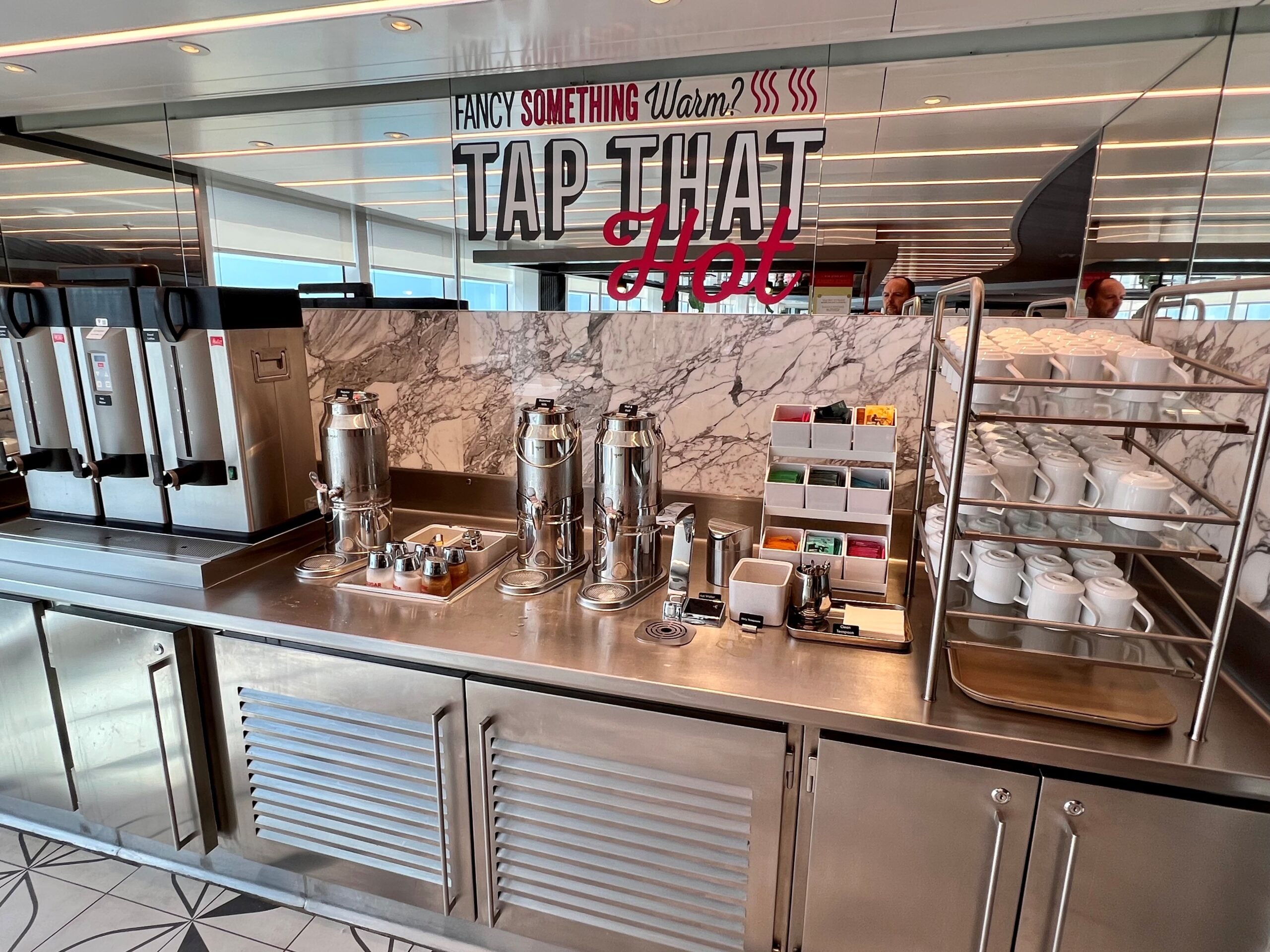 Nonalcoholic drinks also are self-serve from multiple hot and cold drinks stations. There also is a self-serve alcohol station where you can tap a Virgin Voyages-issue wristband to get wine or beer by the glass (for an extra charge).