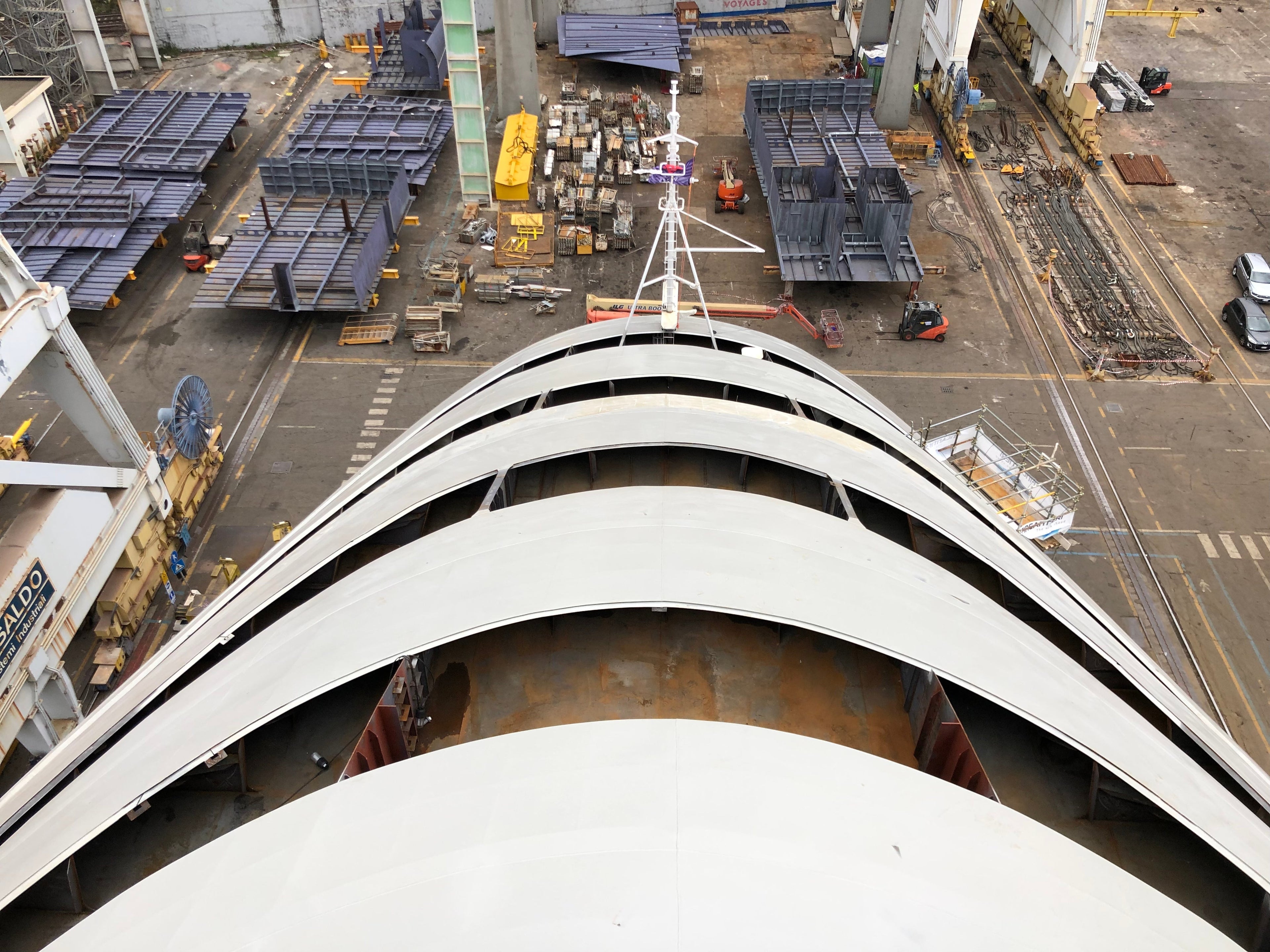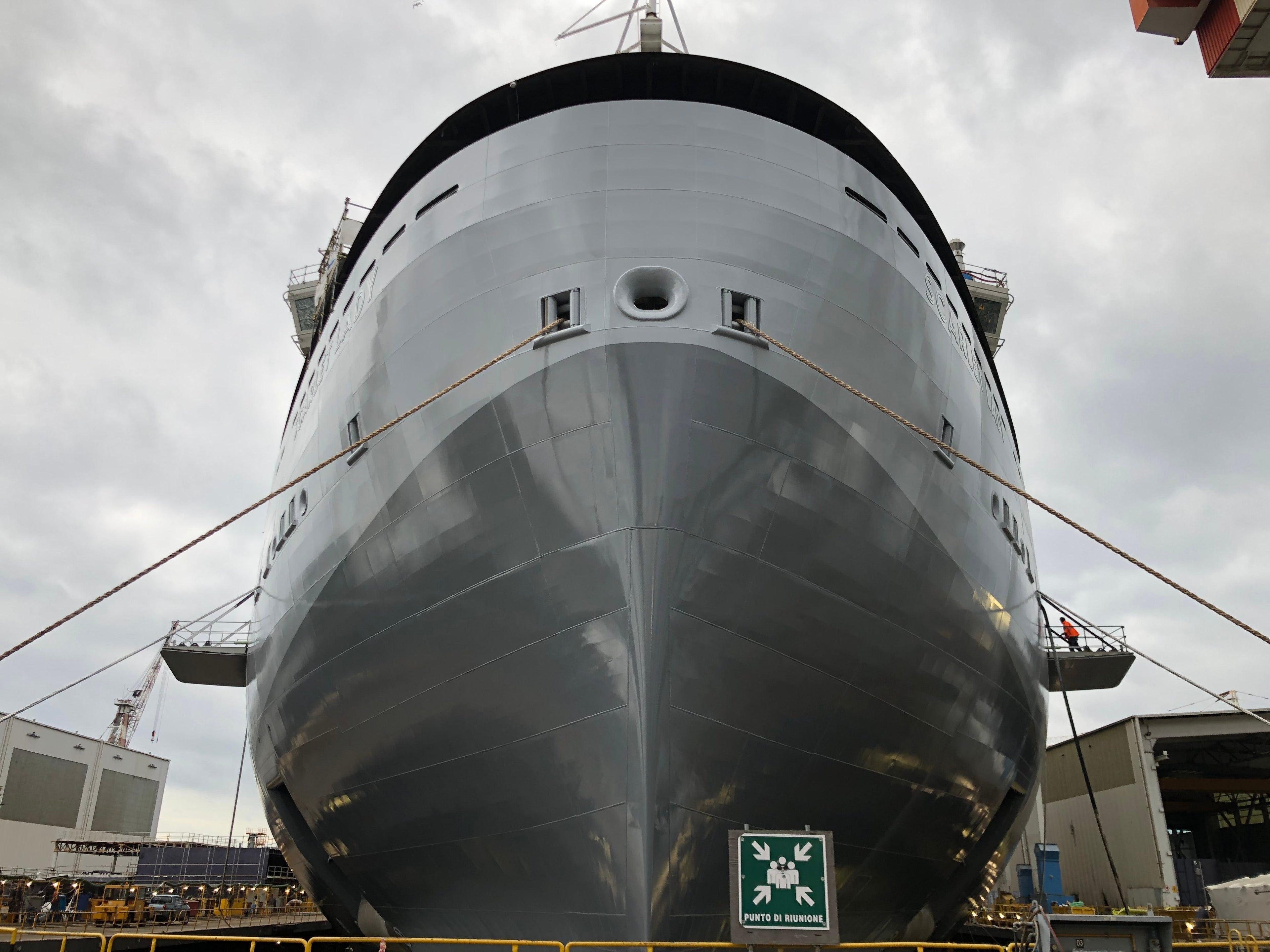 While the interior of the ship still looks skeletal, with a tangle of bright orange and green wires hanging down along exposed ductwork and hieroglyphic-like cues on the wall, the exterior is near completion. Saturday marked the ship's Float Out, the first time a ship enters the water after construction of the frame on land.