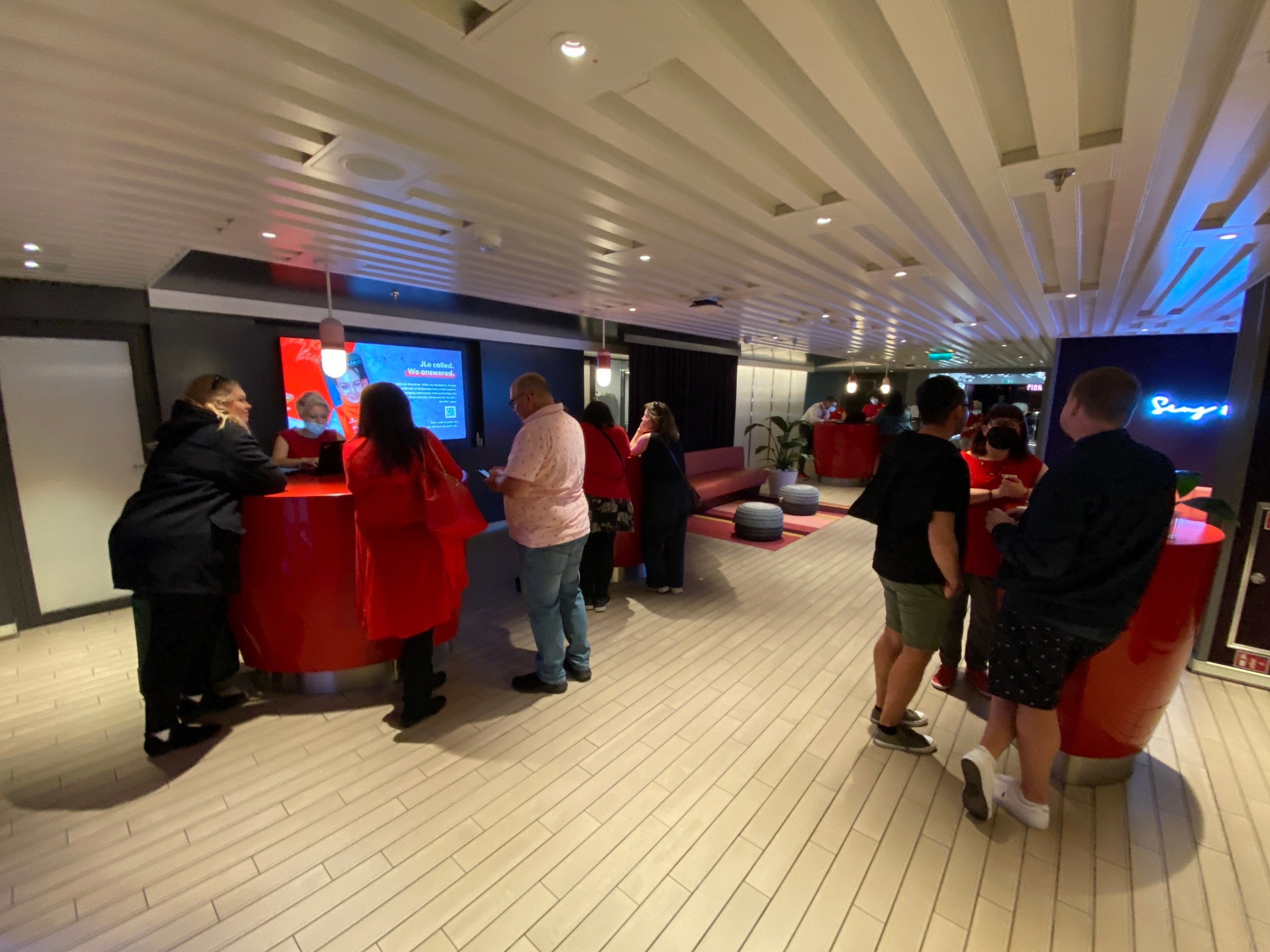 The somewhat chaotic "Sailor Services" desks on Virgin Voyages' Valiant Lady. (Photo by Ashley Kosciolek/The Points Guy)