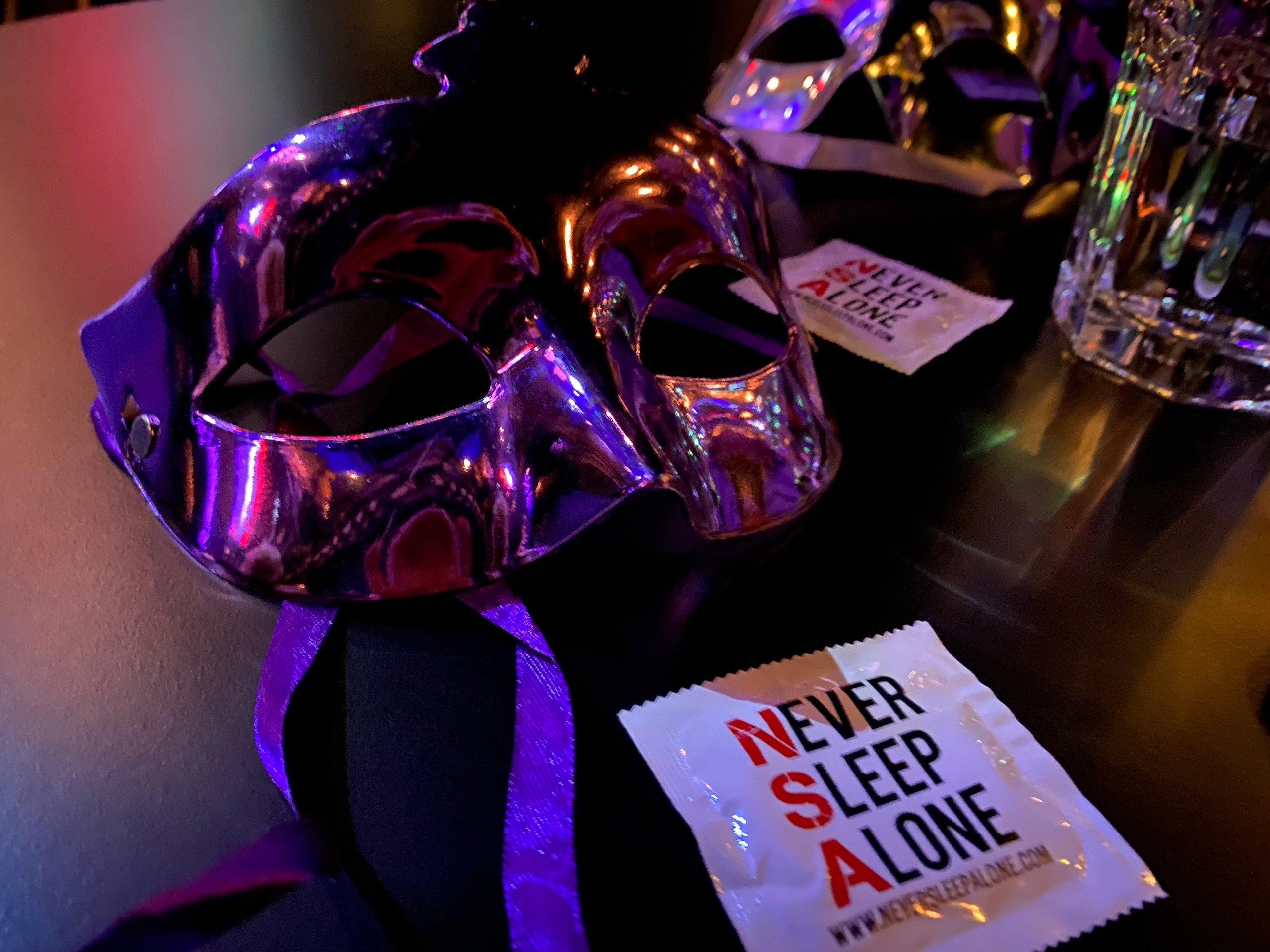 A mask and condoms adorn a table at the risque "Never Sleep Alone" show on Virgin Voyages' Valiant Lady. (Photo by Ashley Kosciolek/The Points Guy)