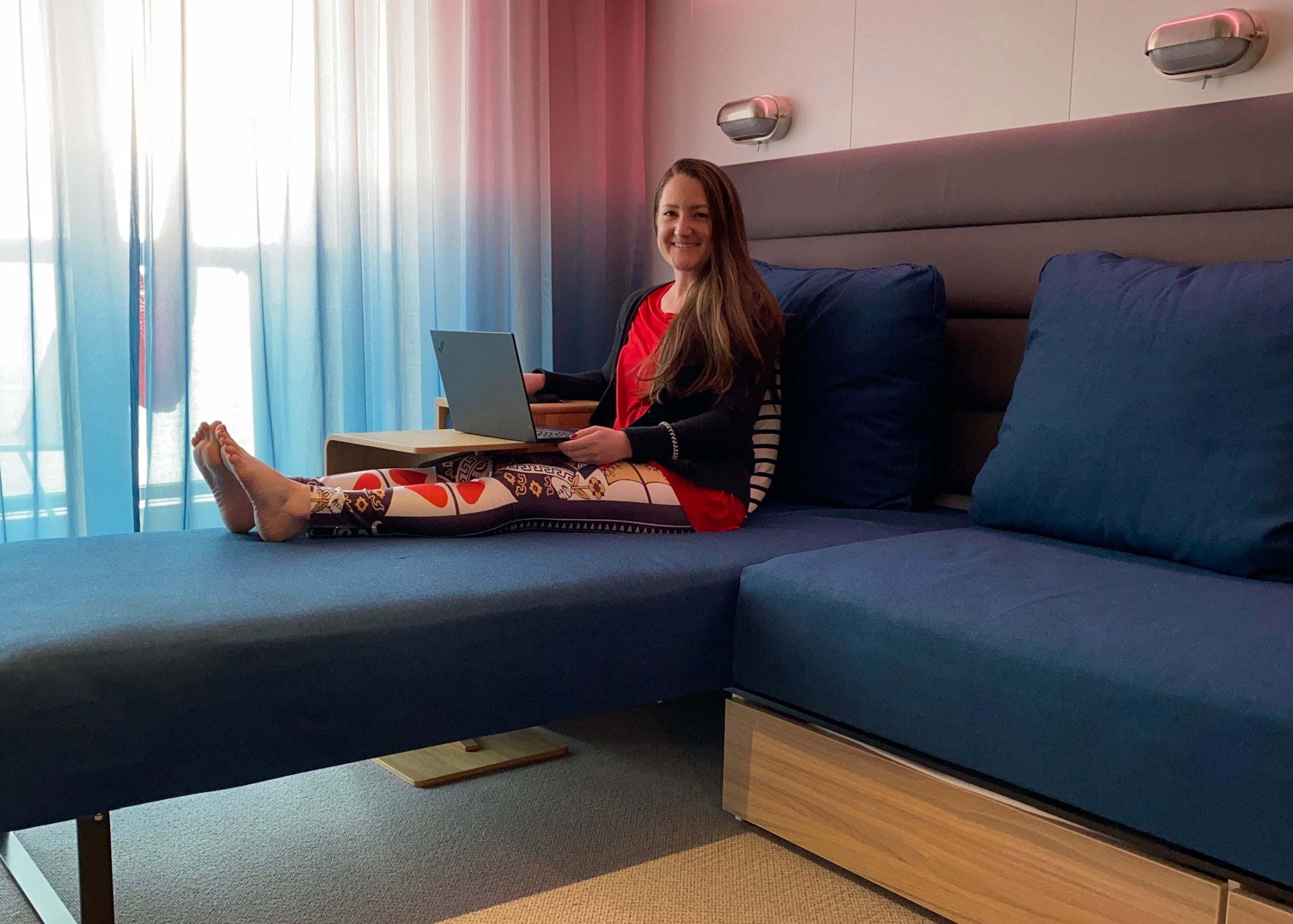 Virgin Voyages' Seabeds make excellent workspaces when in their couch configuration. (Photo by Ashley Kosciolek/The Points Guy)