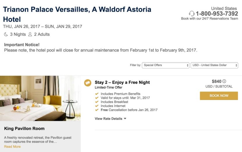 When you click to expand the Stay 2- Enjoy a Free Night menu, you'll get the complete details for the promotion and that certain property. So for this three-night stay at the Waldorf Astoria Versailles, you'd be paying $575 — or about $192 per night — with the promotion. Note that for this property in particular, this package rate (before deducting the third night) matched the hotel's "flex rate," while the HHonors rate totaled $789 (including tax).