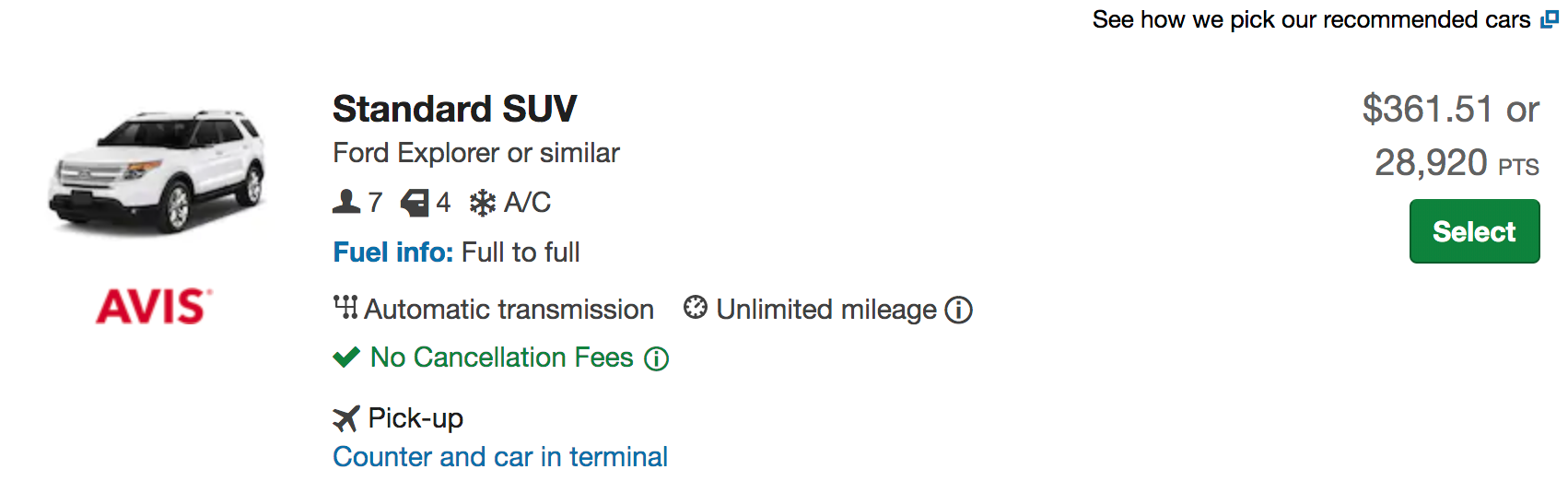 - All you need to do is enter your pick-up and drop-off location, date and time. You'll then be able to pick your preferred car and sort by how many points you need to redeem.