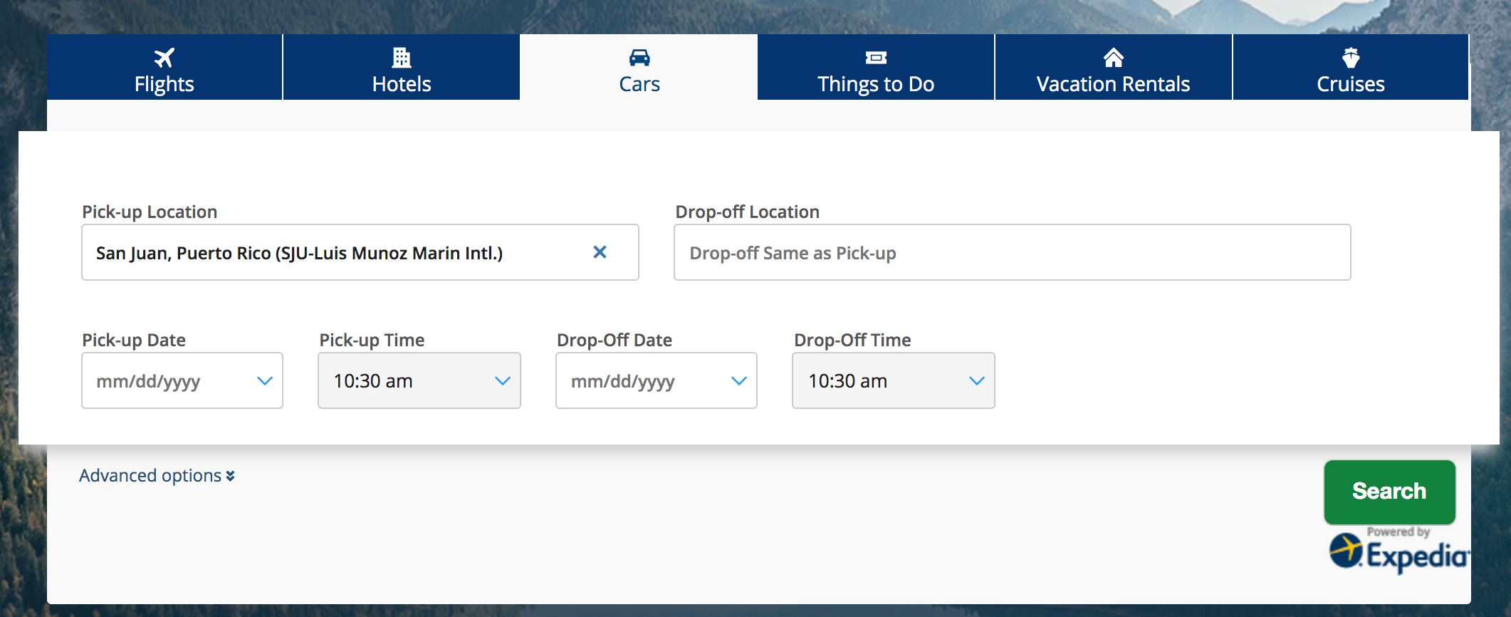 - From the main landing page, navigate to the 'cars' header and type in your itinerary.