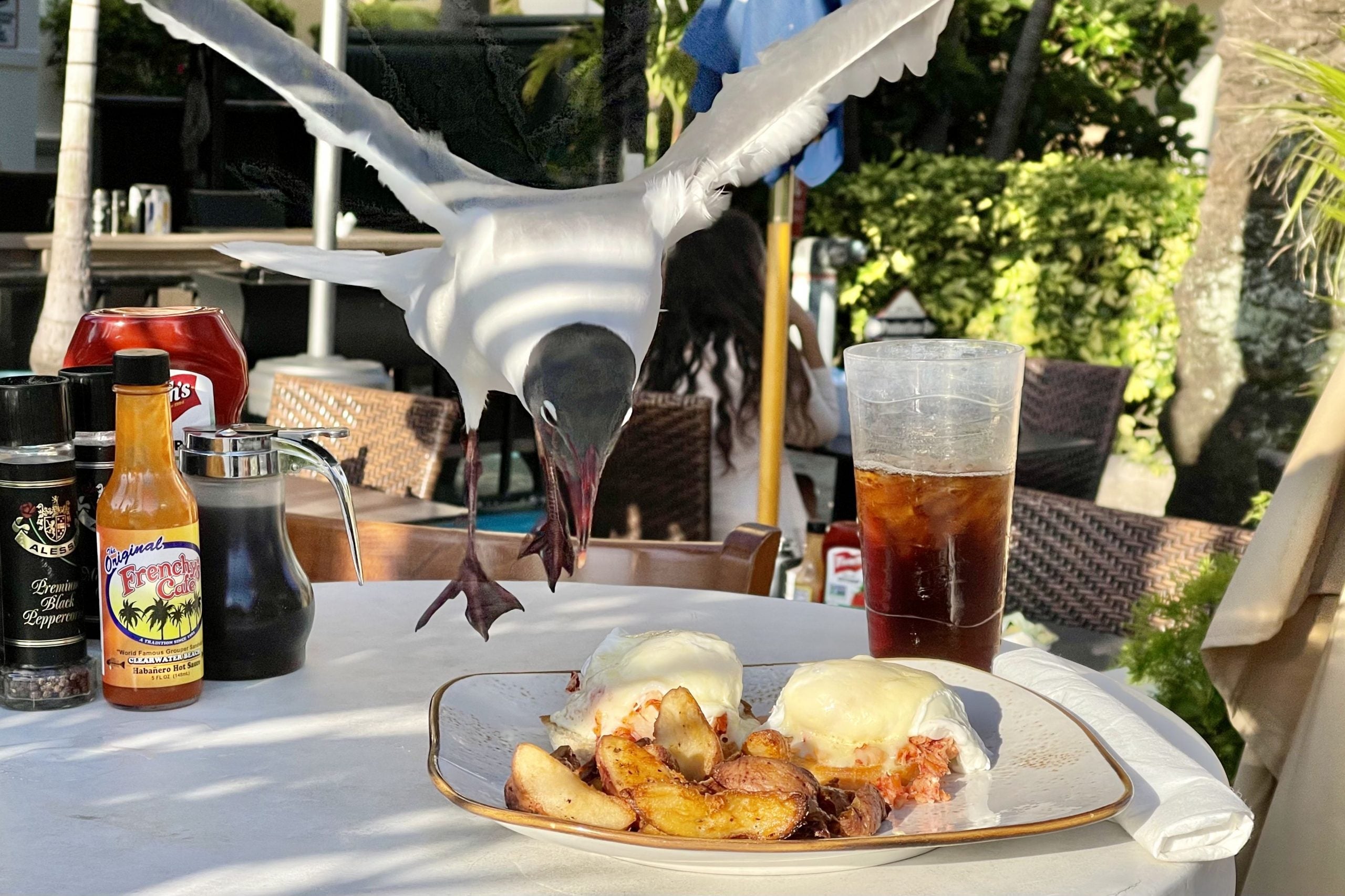At first I was thrilled to find a quiet spot on the sidewalk. However, the absence of other patrons gave a seagull the confidence it needed to swoop down and steal part of my breakfast!