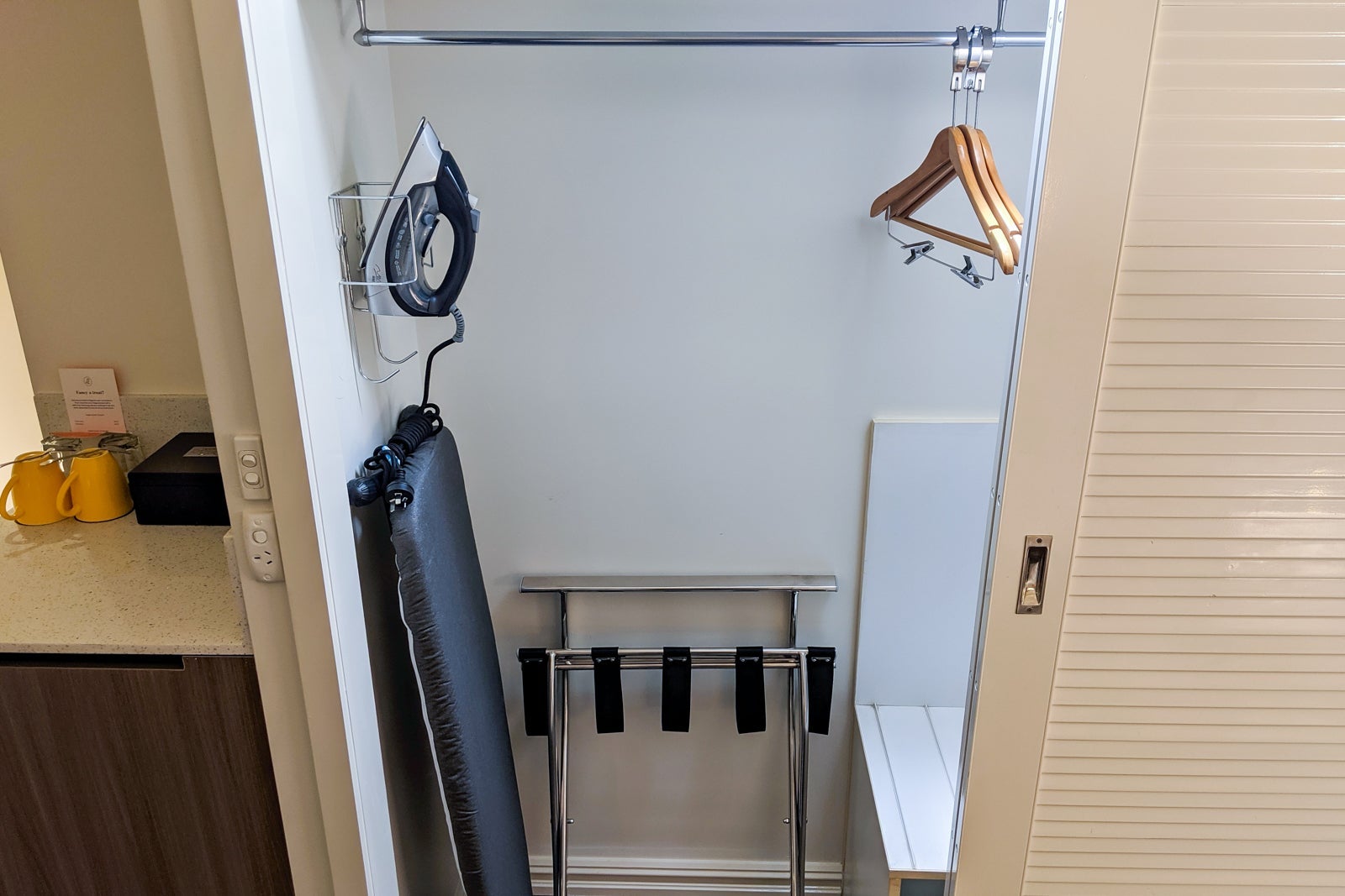 The closet had plenty of storage space and contained a safe, an iron and ironing board, a heavy comforter, a luggage rack and -- strangely for being so far from the bathroom -- the room's hair dryer.